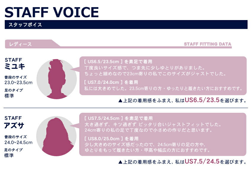 ■着用時のサイズ感 細身、普通の方→「1サイズ大きめ」 甲高、幅広の方→「2サイズ大きめ」 アイテムの足入れは小さめです。