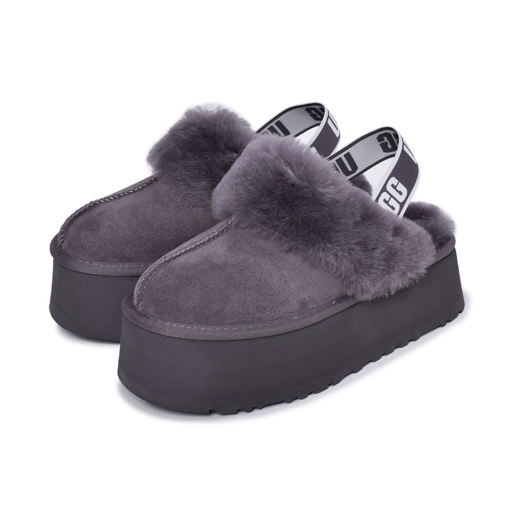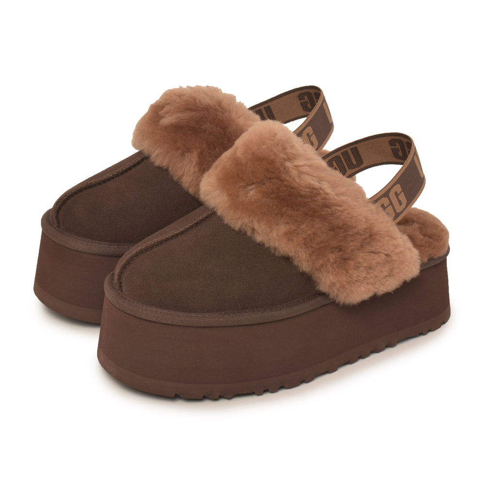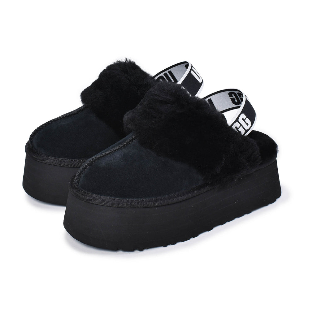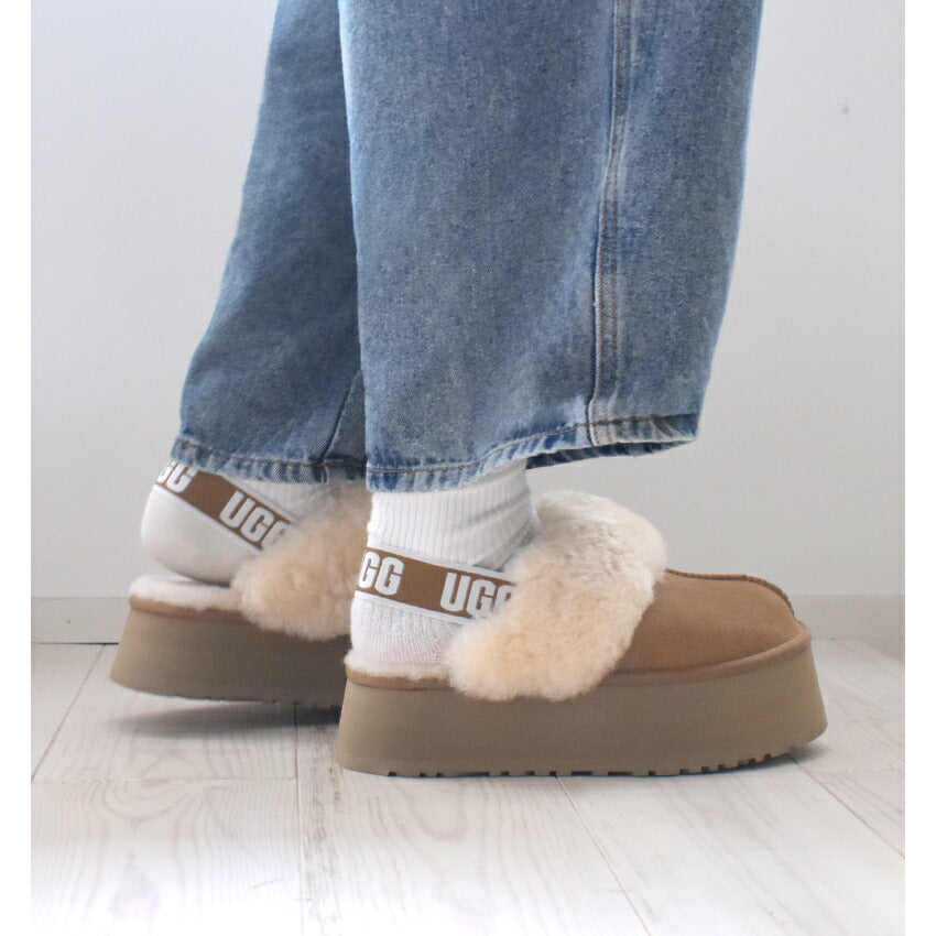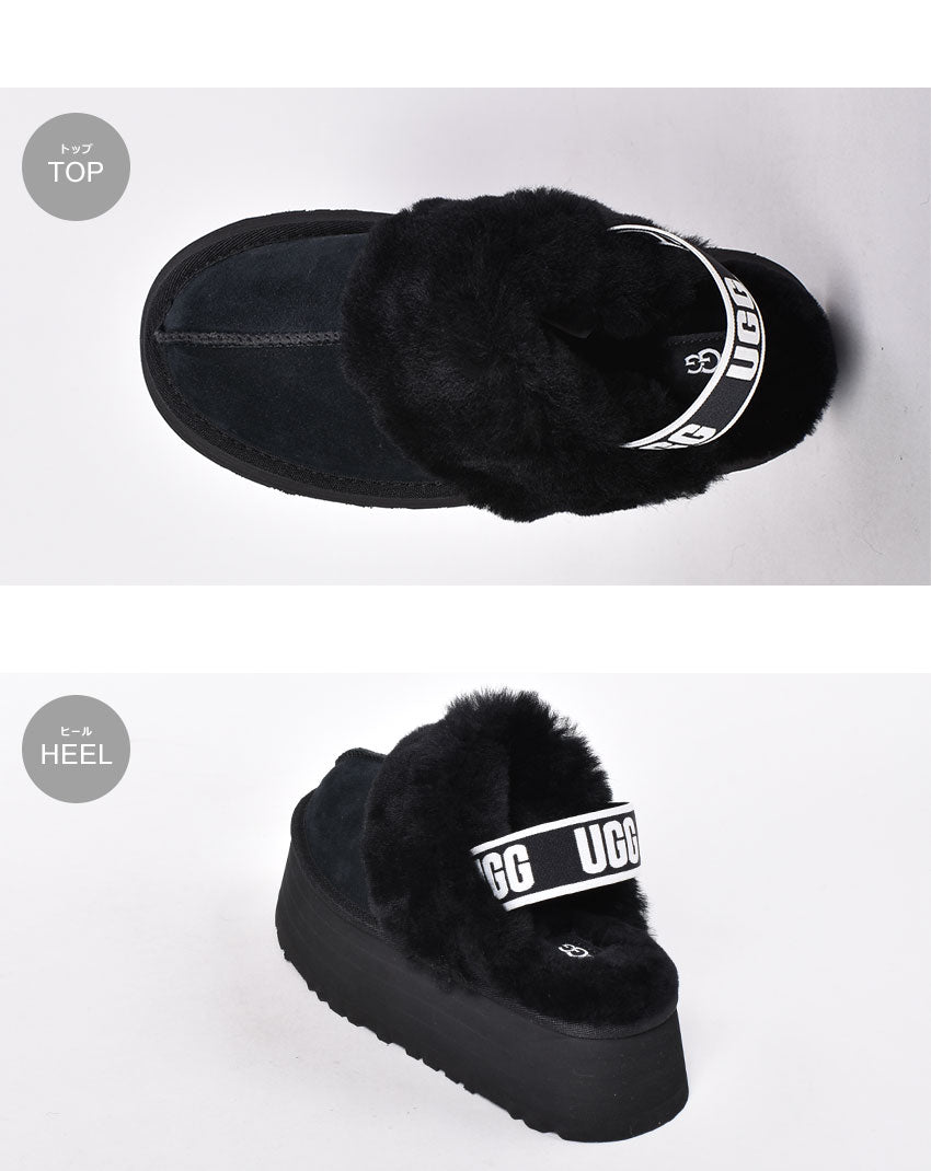 UGGロゴのバックストラップ、シープスキンとプラットフォームソール仕様でインパクトのあるデザインが特徴のサンダル。ソフトなシープスキンが足元を包み込み、履き心地よく暖かに保ちます。スリップしにくいラバーアウトソールを採用しており、室外での使用も可能です。