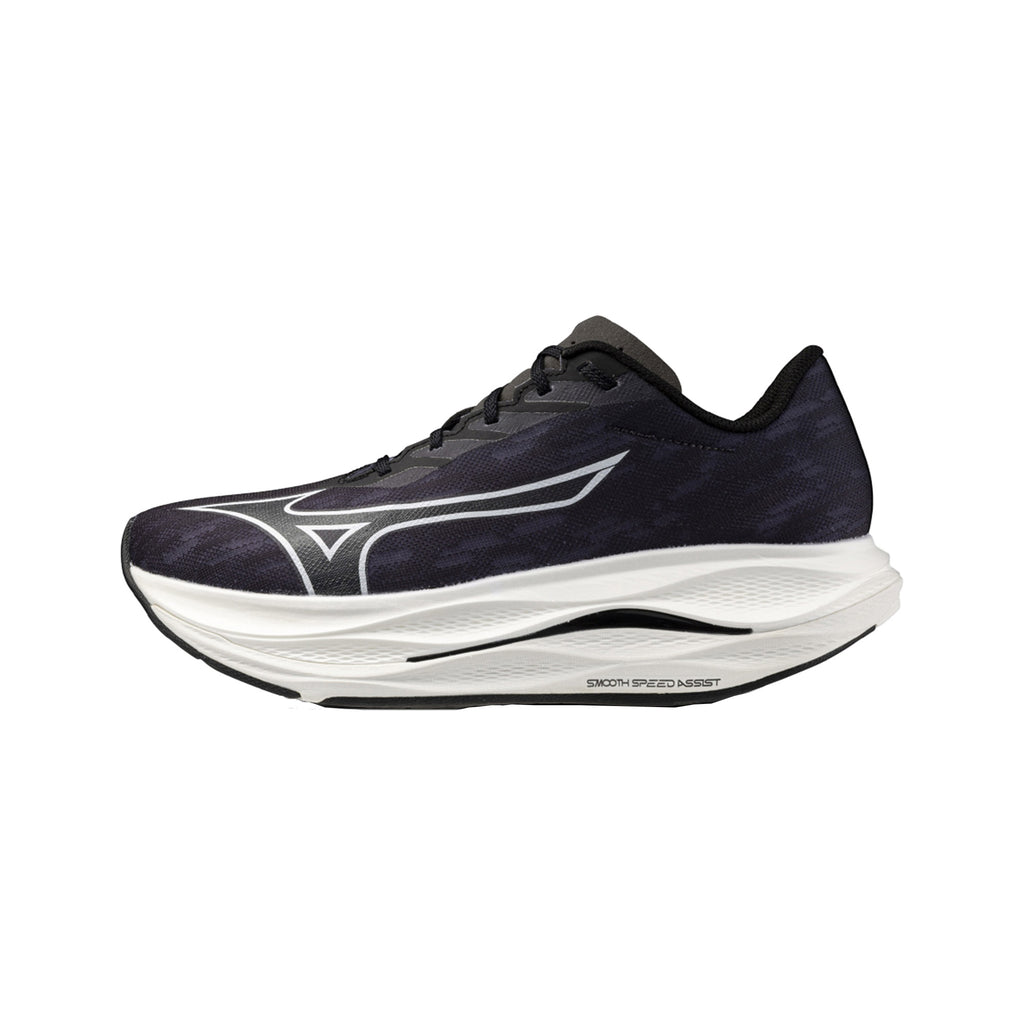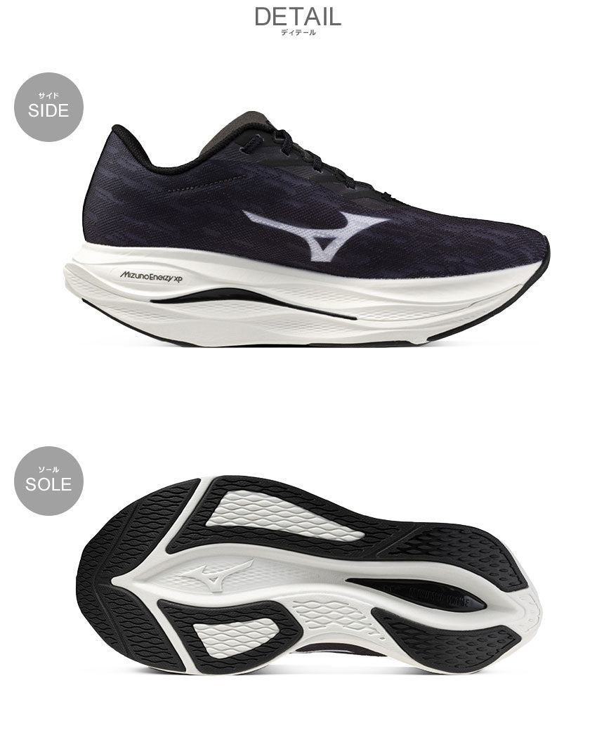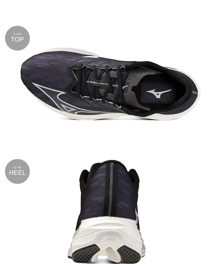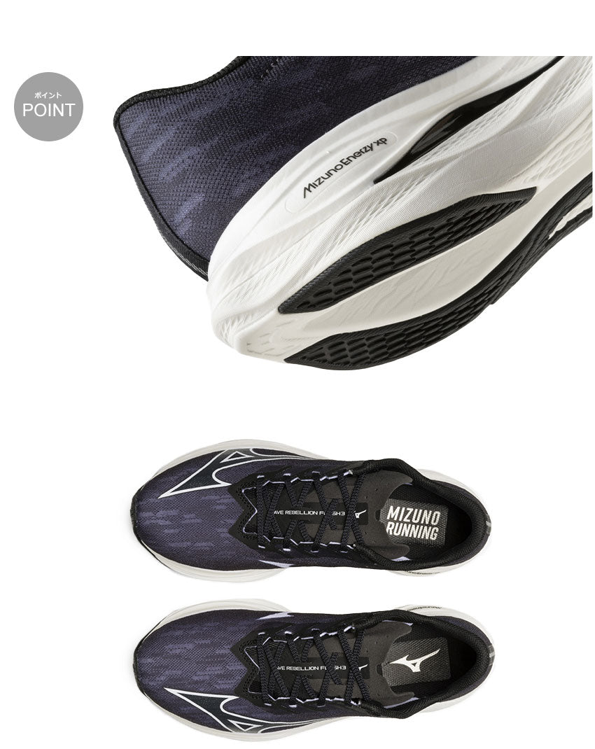 足の幅が広いランナーの方向けワイドモデルです。サブ3.5を狙うランナーのためのレースシューズ WAVE REBELLION FLASH 3 ワイド。独自のソール形状によって筋腱の負担を軽減。ソールに搭載された異なる2層の高反発素材が接地時の衝撃を推進力に変え、スムーズなフォアフット接地をアシスト。レース後半でもフォームの崩れを抑え、限界まで力を引き出します。アッパー本体や裏地、インソール表面のテキスタイルに90%以上のリサイクル素材使用、ウエーブプレートには植物由来素材を採用したサステナブルな設計です。