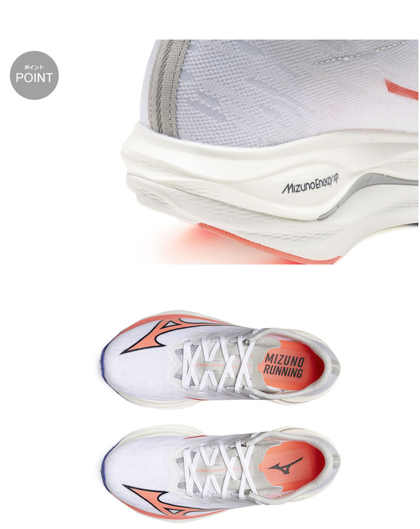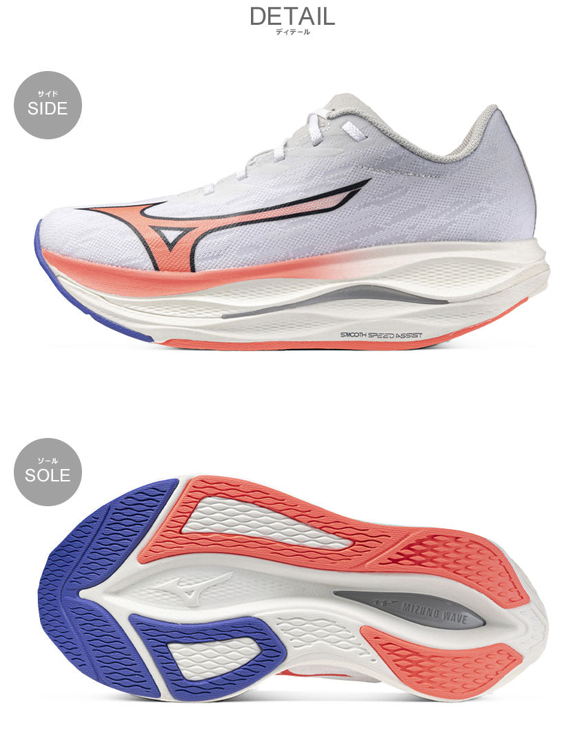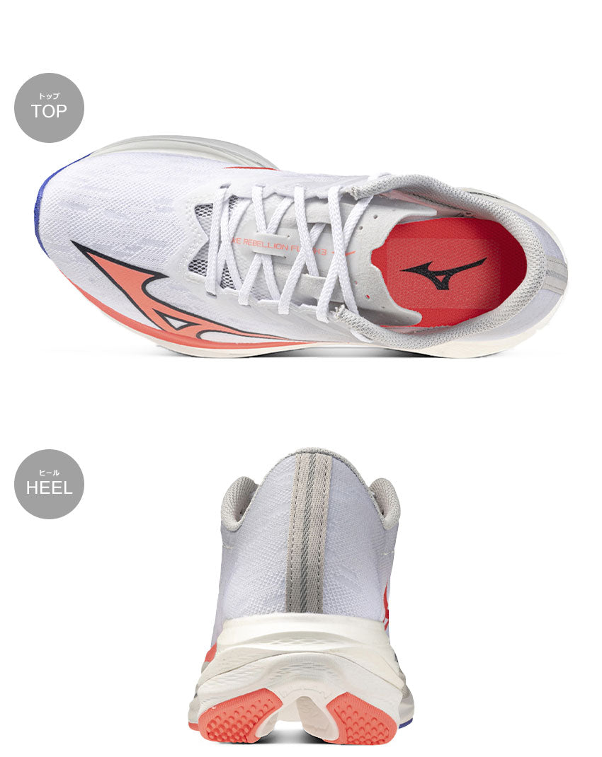 サブ3.5を狙うランナーのためのレースシューズ、WAVE REBELLION FLASH 3。独自のソール形状によって筋腱の負担を軽減。レース後半でもフォームの崩れを抑え、限界まで力を引き出します。ソールに搭載された異なる2層の高反発素材が接地時の衝撃を推進力に変え、スムーズなフォアフット接地をアシスト。