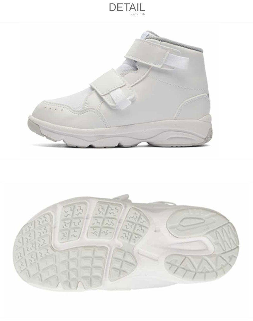 足裏のアーチが発達し、正しい歩き方を身につけていく約3歳から7歳の児童向けに展開する「PRESCHOOL」シリーズ。安定性を重視したハイカットタイプのシューズです。2本ベルトで足首と甲をしっかりホールド。履き口が大きく開くオープンベロ構造で、脱ぎ履きがスムーズです。かかとを安定させるため、かかと部に樹脂製ヒールカウンターを内蔵し、シューズと足との一体感を高めています。中敷はかかとの形状に合わせた3D設計で、優しく包み込むようなフィット感。インナーソールの素材には抗菌・消臭効果のあるシャインアップと、汗をすばやく吸収、拡散してドライ感を保つウォーターマジックを採用。靴の中を快適に保ちます。アッパーには光沢を抑えたマットな質感の人工皮革を採用し、通学から外遊びまで、さまざまなシーンでコーディネートしやすいアイテム。街灯や車のライトなどの光を反射する再帰反射材(リフレクター)をかかと部に採用しています。