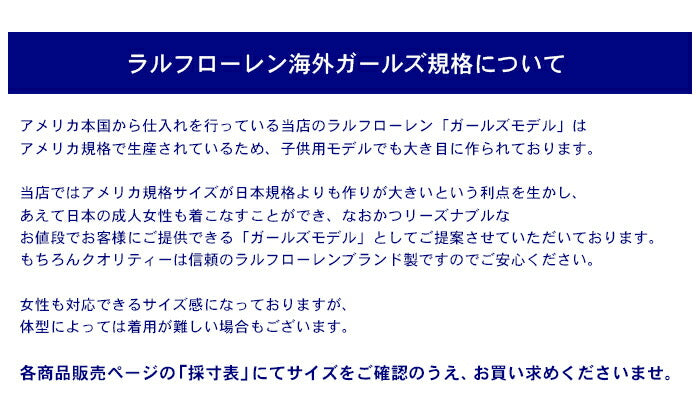 ■商品特性1:こちらはラルフローレンGIRLSモデルです。アメリカ人の子供向け規格のため、子供向けサイズとしては大きな作りとなっており、日本人の女性にも着用しやすいサイズ感となっております。サイズをお選びの際は、採寸表をよくご確認下さいませ。
