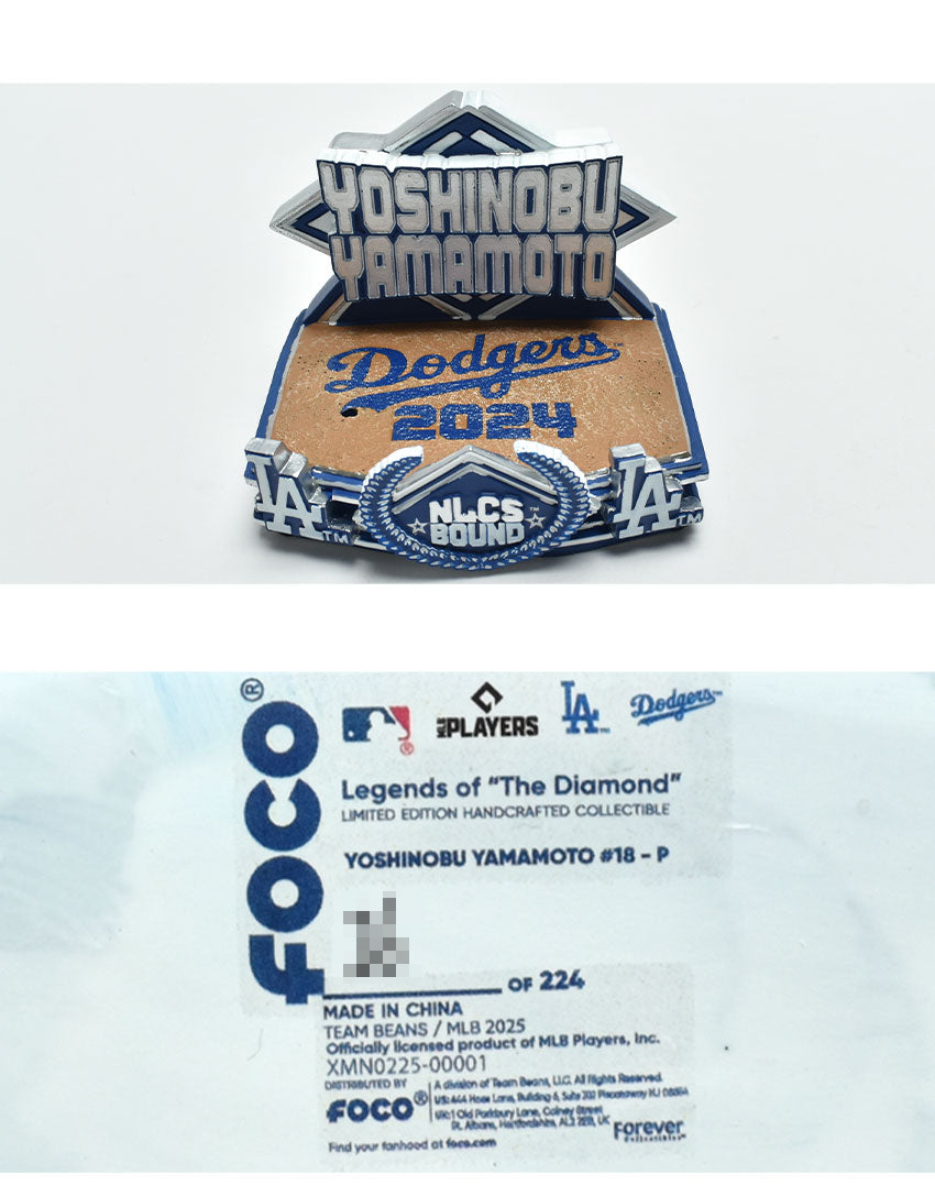 ホワイトのユニフォームを身にまとい、力強い投球フォームで再現された山本由伸投手が、チームをNLCSへ導く決意を体現。ベース上部はフィールドの質感を再現し、正面には「NLCS BOUND」の文字やチームロゴがあしらわれ、チームの快進撃を誇らしくアピールできます。ひとつひとつ丁寧に手作業で作られ、手塗りで仕上げられたこのボブルヘッドは、山本投手とドジャースのポストシーズンの軌跡を永遠に残す、ファン必携の逸品です。
