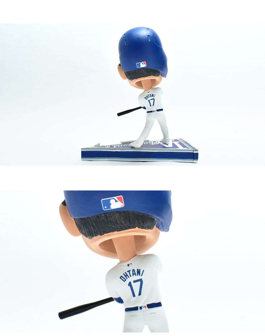 ホワイトのユニフォームをまとい、バッティングアクションポーズを決める大谷翔平選手が、まさにチャンピオンの舞台を彩ります。チームカラーでデザインされたペナント型のベースには、チームロゴと「2024 NATIONAL LEAGUE CHAMPIONS」の文字が刻まれ、その栄光を誇らしく表現。手作業で制作されたこのボブルヘッドは、大谷翔平選手とドジャースの2024年リーグ制覇を記念するアイテムです。