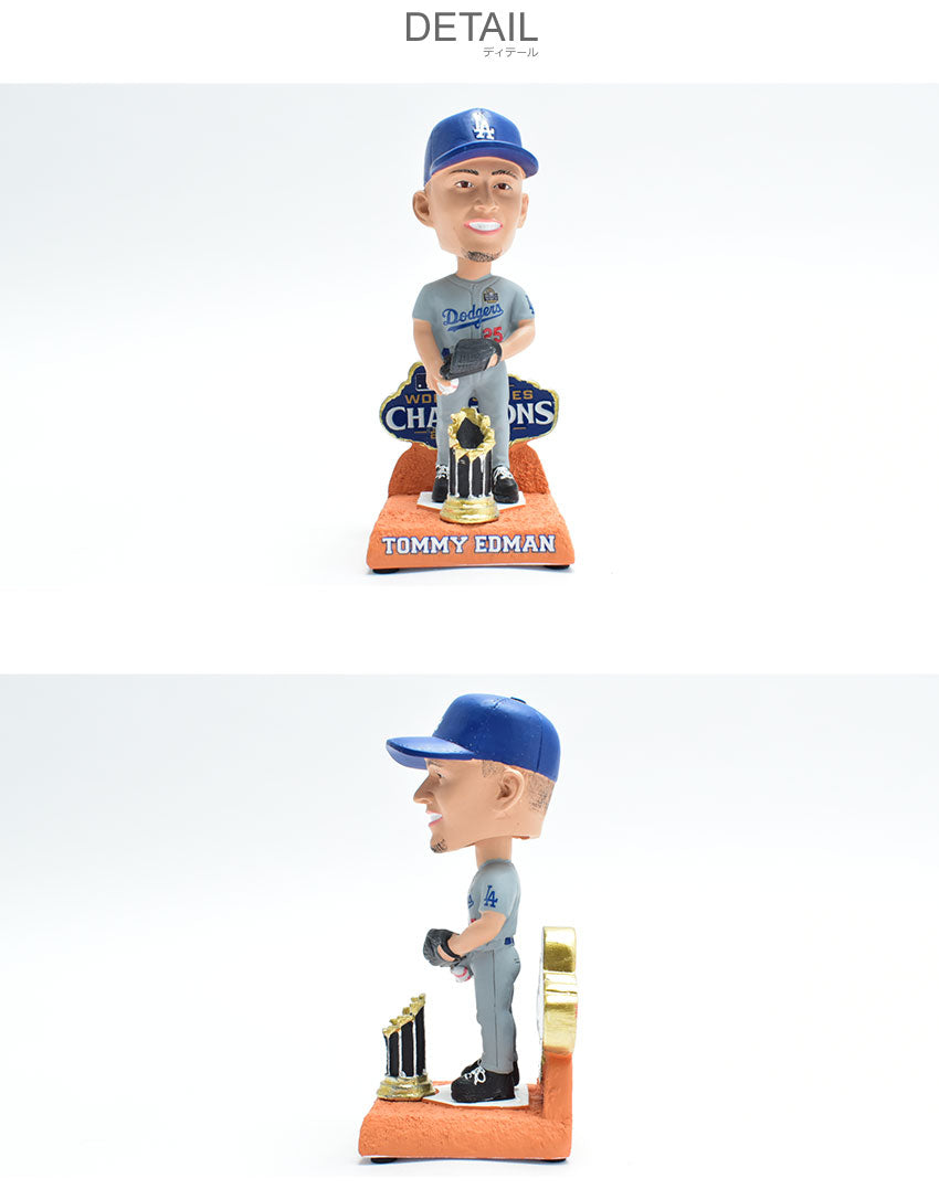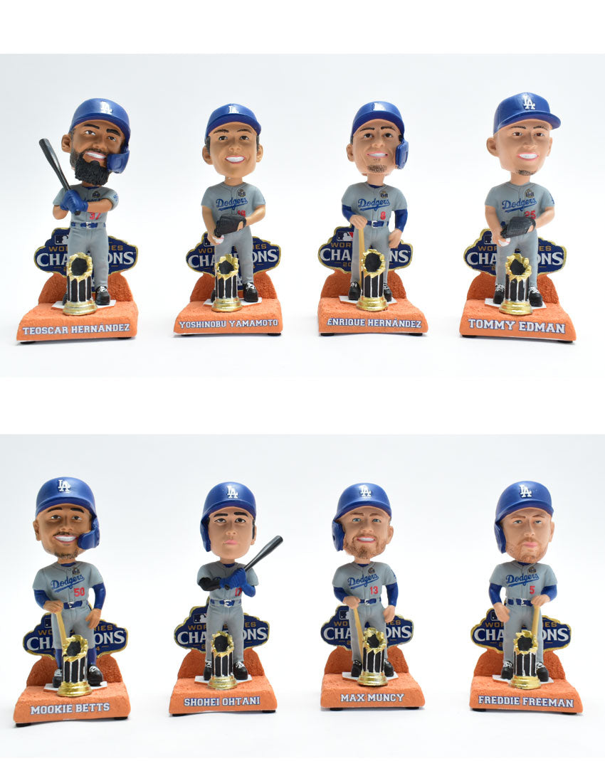 フレディ・フリーマン、マックス・マンシー、キケ・ヘルナンデス、ムーキー・ベッツ、トミー・エドマン、テオスカー・ヘルナンデス、大谷翔平、そして山本由伸という、チャンピオンシップを支えたスター選手たちを一堂に集めた豪華な8体セットが登場しました。各選手はグレーのゲームユニフォーム姿で再現され、背後には記念ロゴをデザイン。さらに、ベース上部には優勝トロフィーのアクセントとホームプレートをあしらい、歓喜の瞬間をいつでも思い出せる仕様となっています。