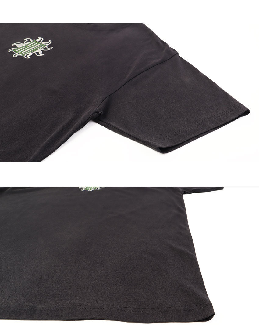 程よい厚みの上質な素材を使用し、一枚でも透けにくく型崩れしにくいタフさが魅力です。着込むほどに風合いが増し、ヴィンテージライクな雰囲気も楽しめます。フロント中央の刺繍アートワークがワンポイント。デイリーユースからストリートスタイルまで、幅広いシーンにフィットします。