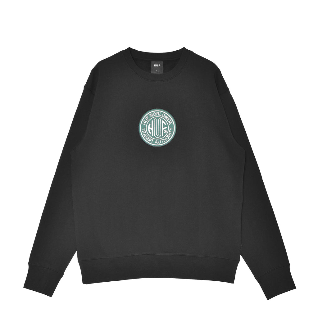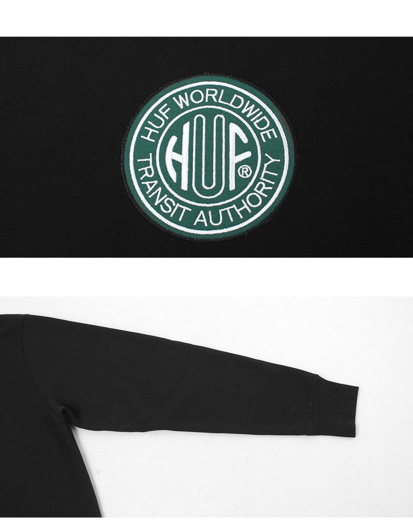 柔らかなコットンポリ素材を使用したTRANSIT AUTHORITY CREWNECK。胸中央には刺繍サテンアップリケとジグザグ刺繍のアートワークをあしらい、シンプルながら存在感のあるデザインに仕上げました。首元の内側にはHUFの織りラベルが添えられ、細部までこだわりを感じられる一着です。