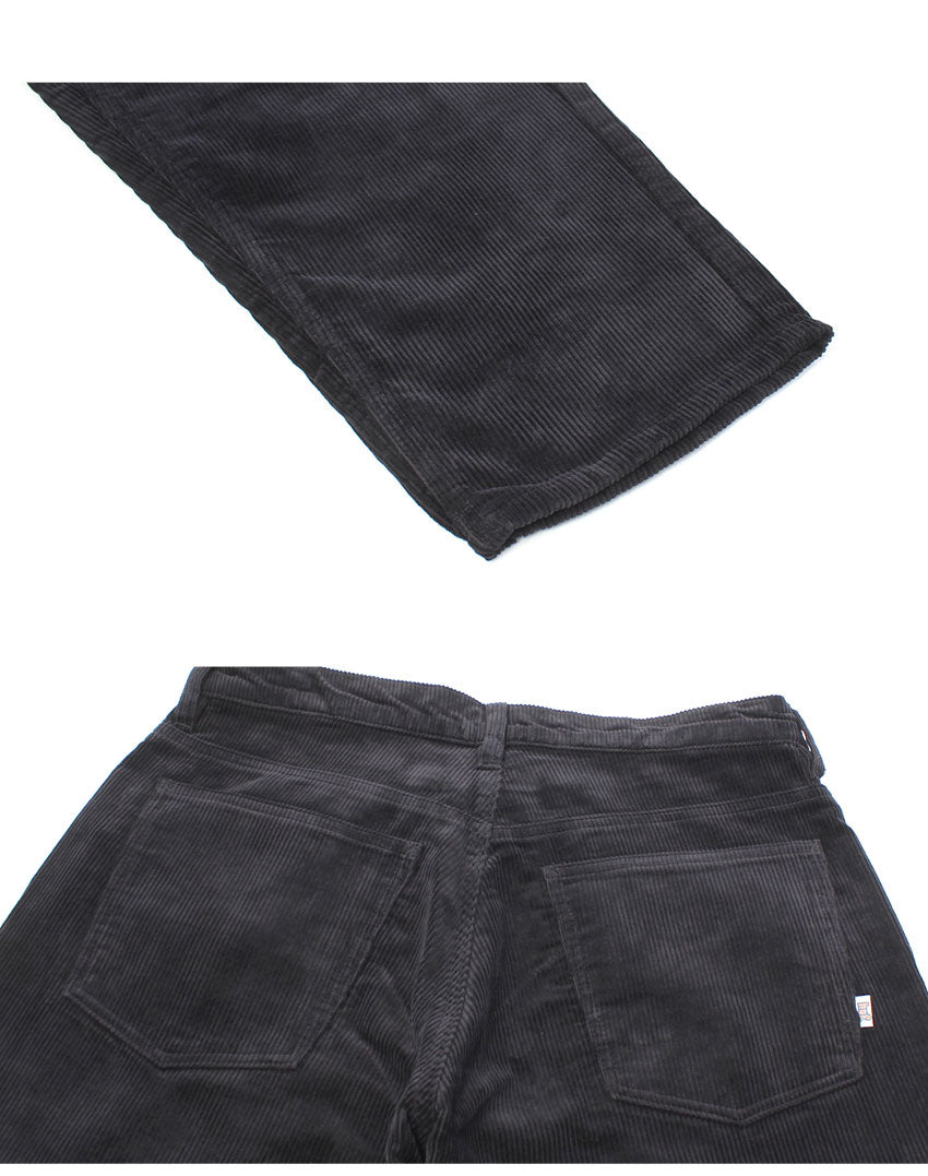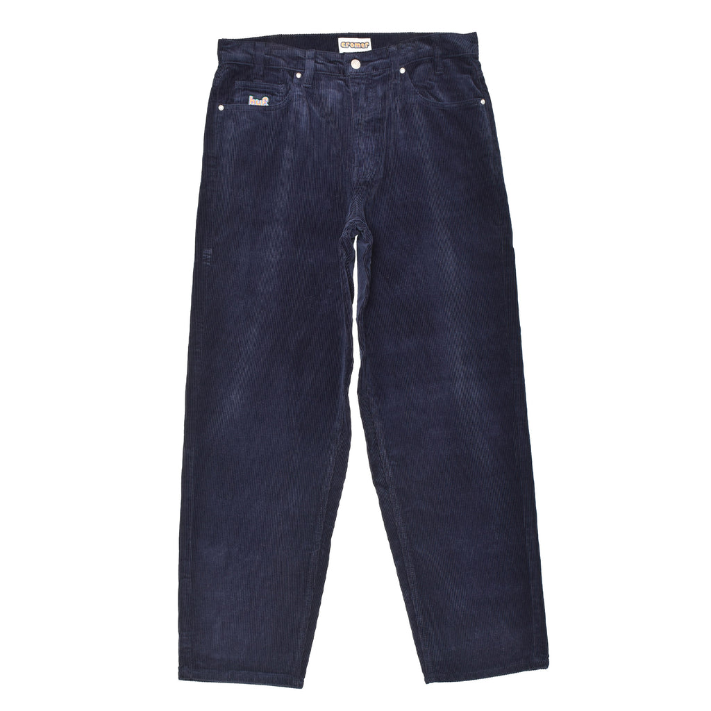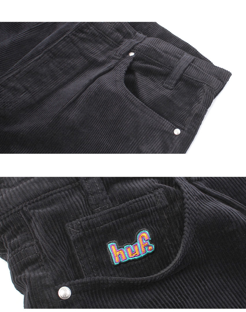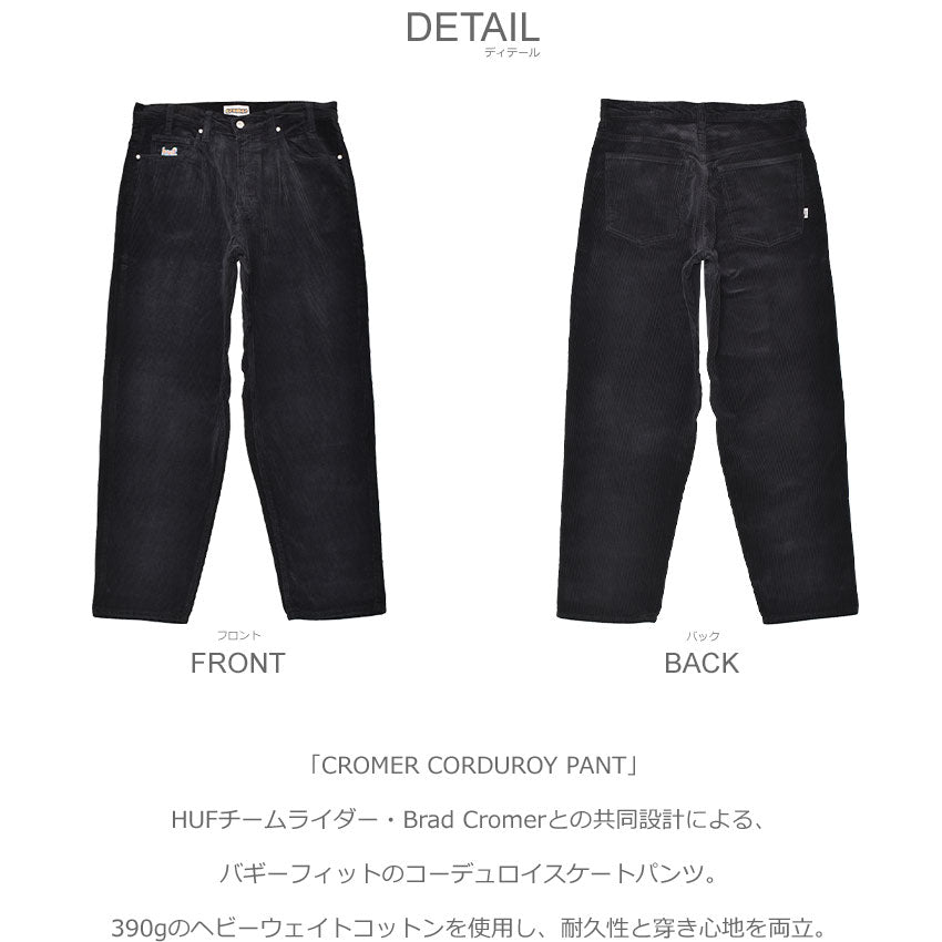 HUFチームライダー・Brad Cromerとの共同設計による、バギーフィットのコーデュロイスケートパンツ。ヘビーウェイトコットンを使用し、耐久性と穿き心地を両立。5ポケット仕様で、コインポケットには刺繍ロゴ入り。HUF WORLDWIDEのメタルシャンクとジップ開閉、主要箇所にはダブルニードルステッチで補強。ウエスト内側にはCROMER織りラベルを配したディテールにも注目。