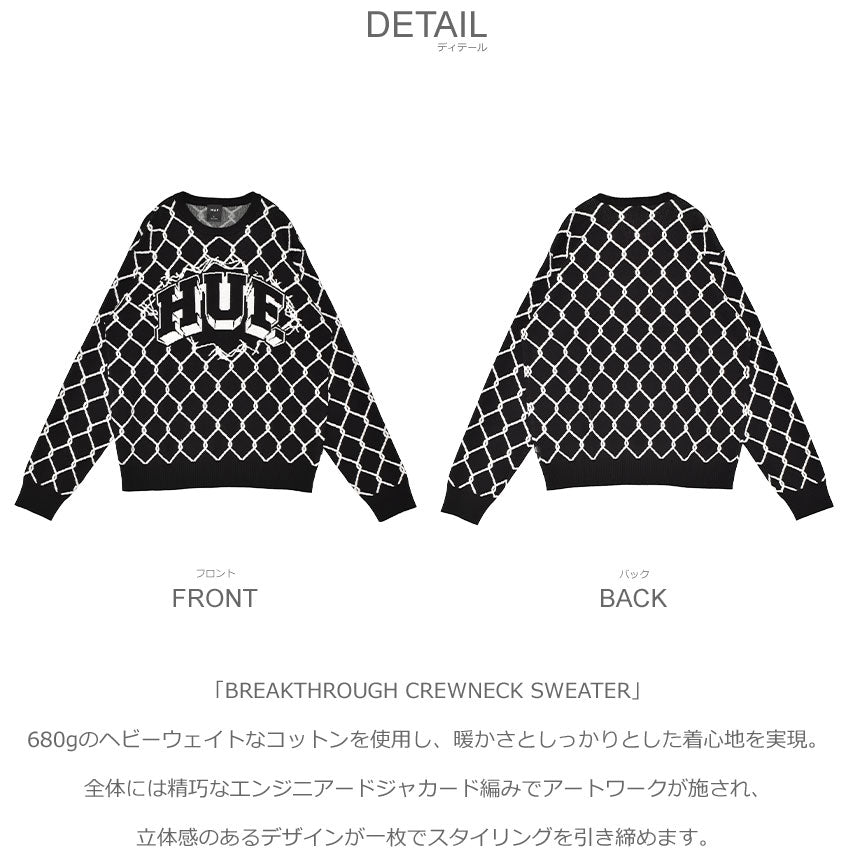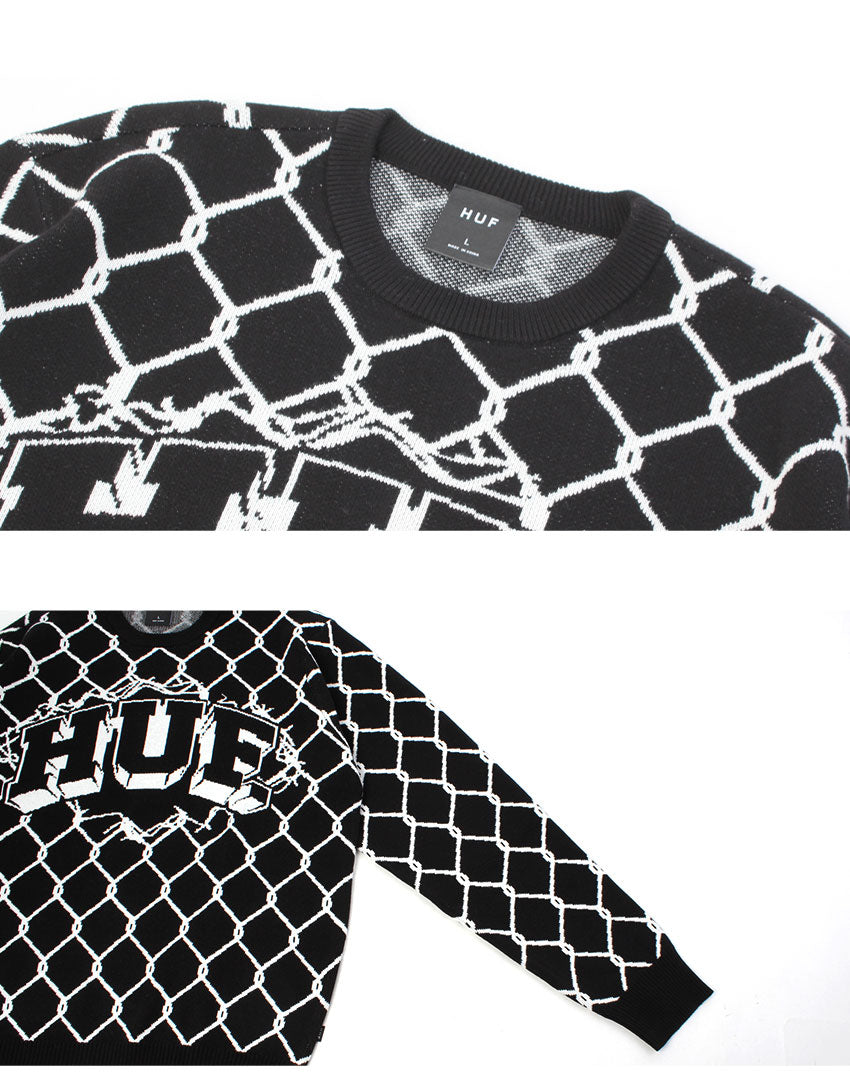 ヘビーウェイトなコットンを使用し、暖かさとしっかりとした着心地を実現。全体には精巧なエンジニアードジャカード編みでアートワークが施され、立体感のあるデザインが一枚でスタイリングを引き締めます。襟元、袖口、裾には1×1リブニットを採用し、快適なフィット感と高い耐久性を両立。首の内側にはHUFの織りラベルを配置し、ディテールにもブランドのこだわりを感じさせます。
