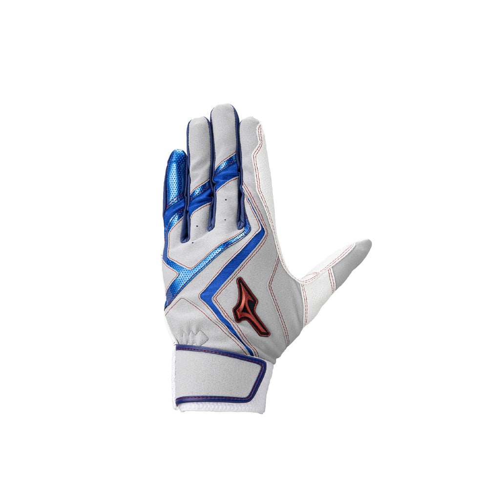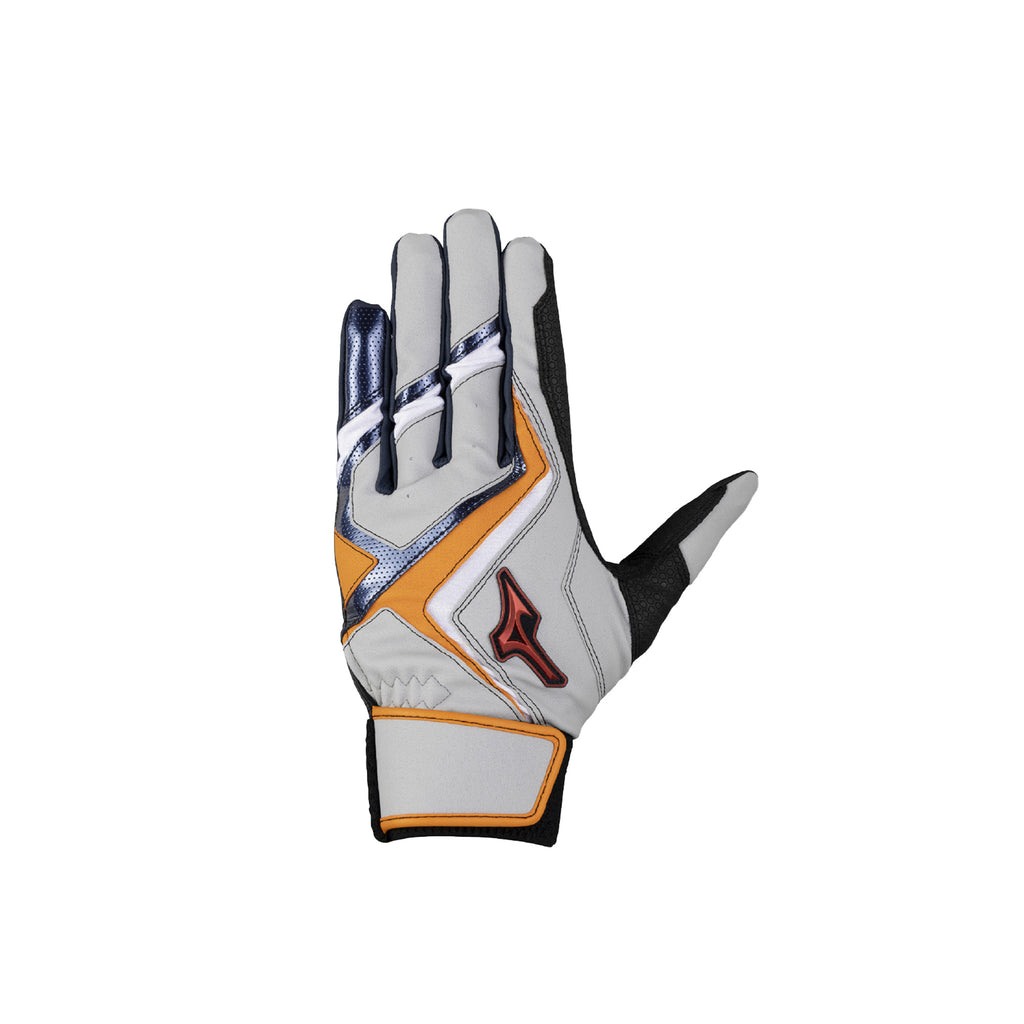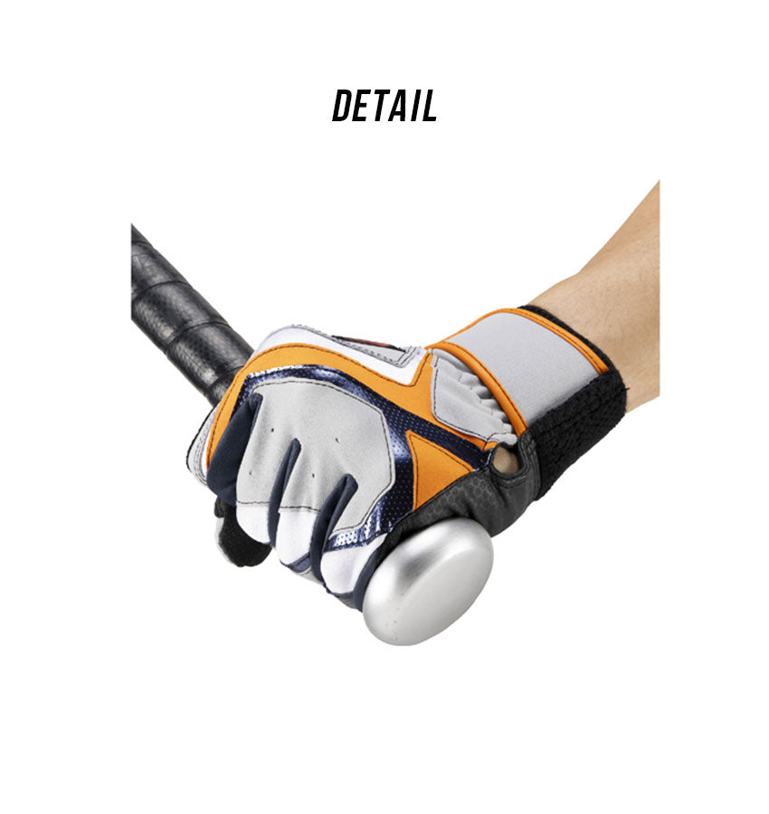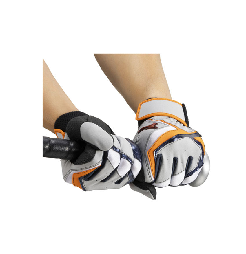 スイング時の力の流れ・強さを分析し、バットへ力を伝えるのに重要な“小指・薬指・中指”と“当て革部”に、表裏両面に高いグリップ力を誇る『特殊合成皮革』を採用。指部には、手袋の内側から当て縫製することで、グリップとの接地面のみならず、手袋内部へも高いグリップ力/密着性を与えます。