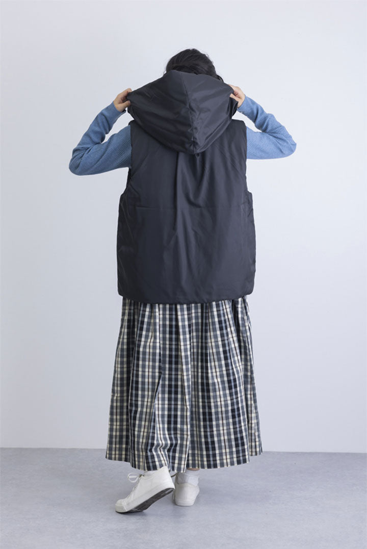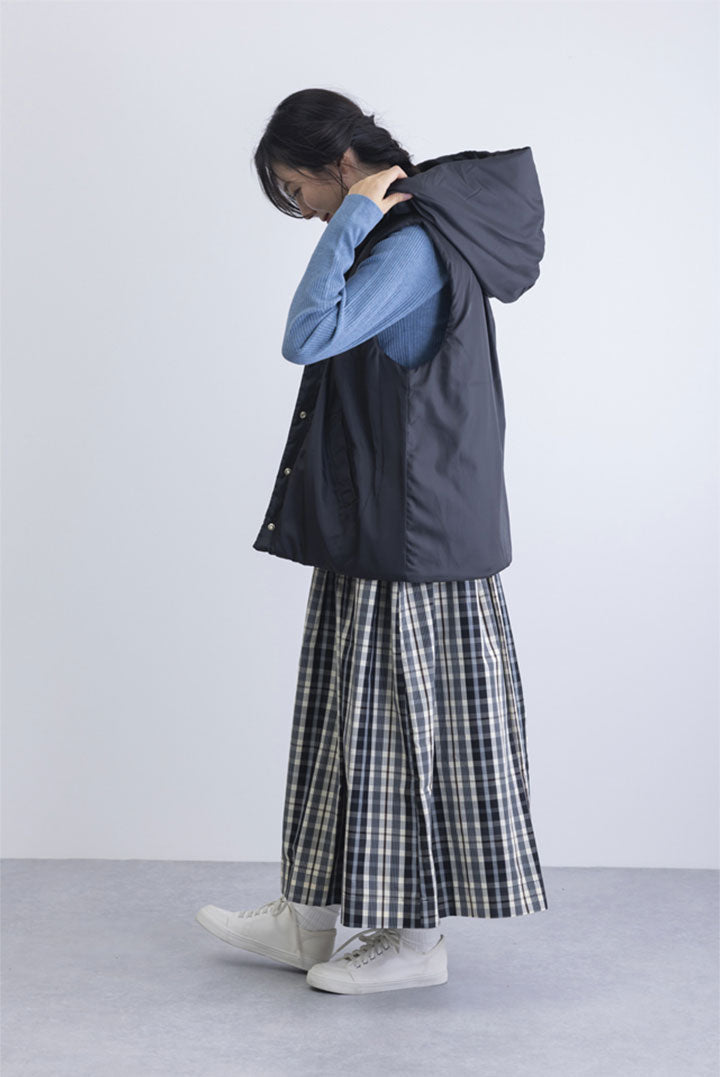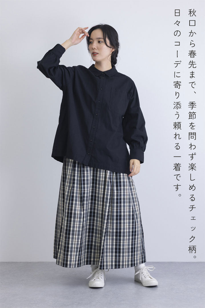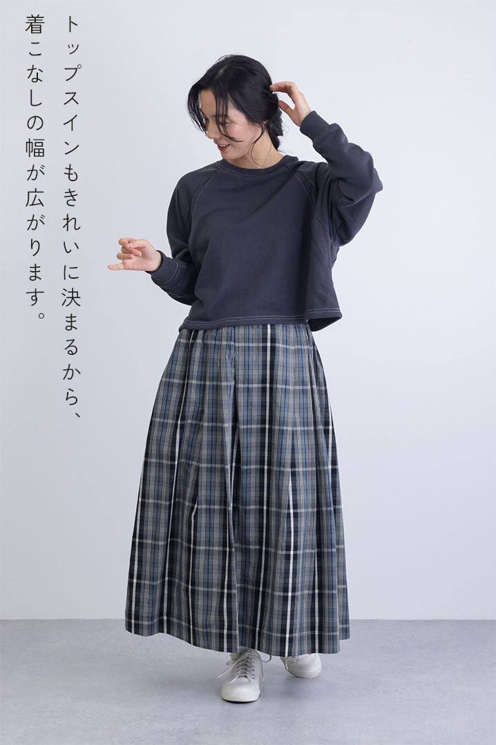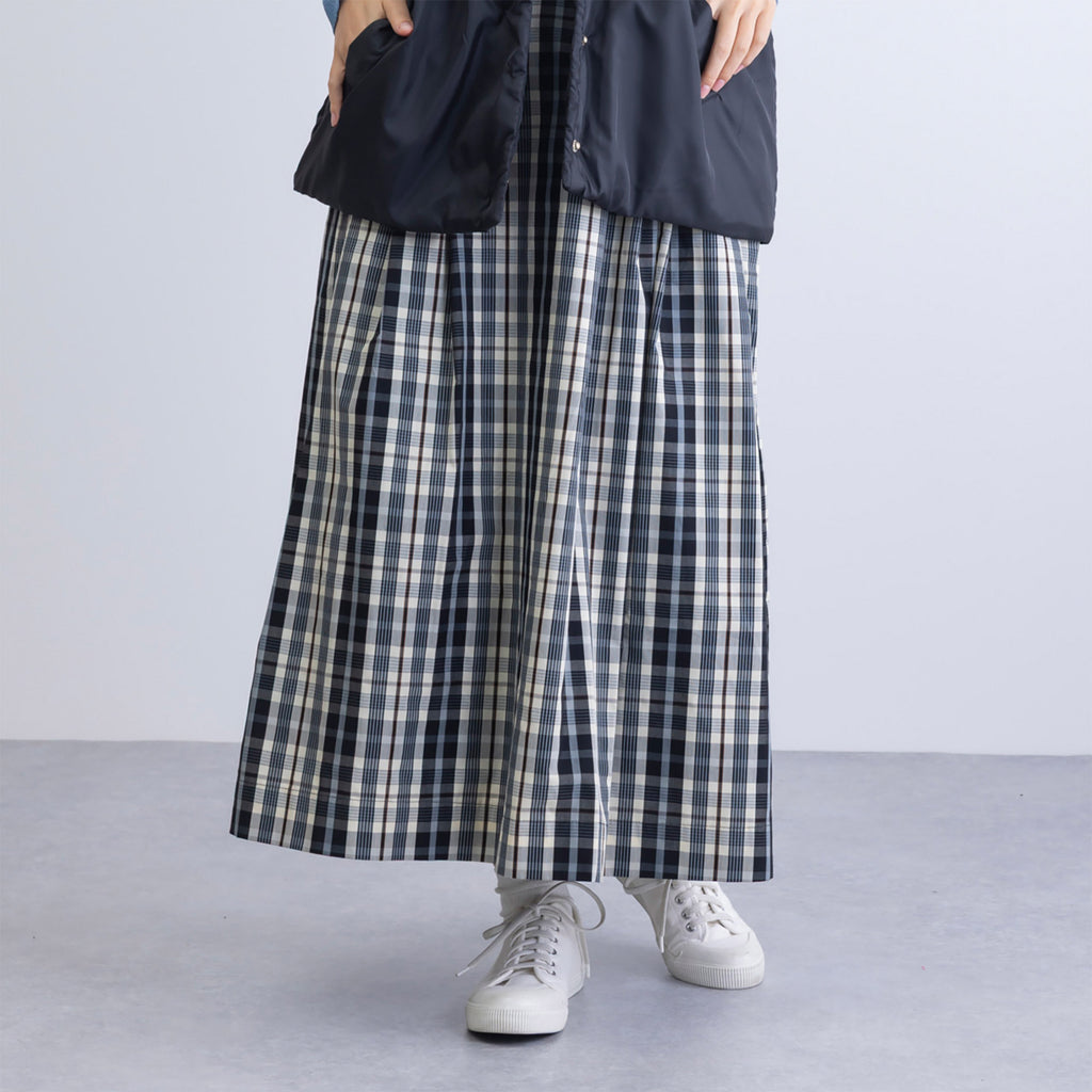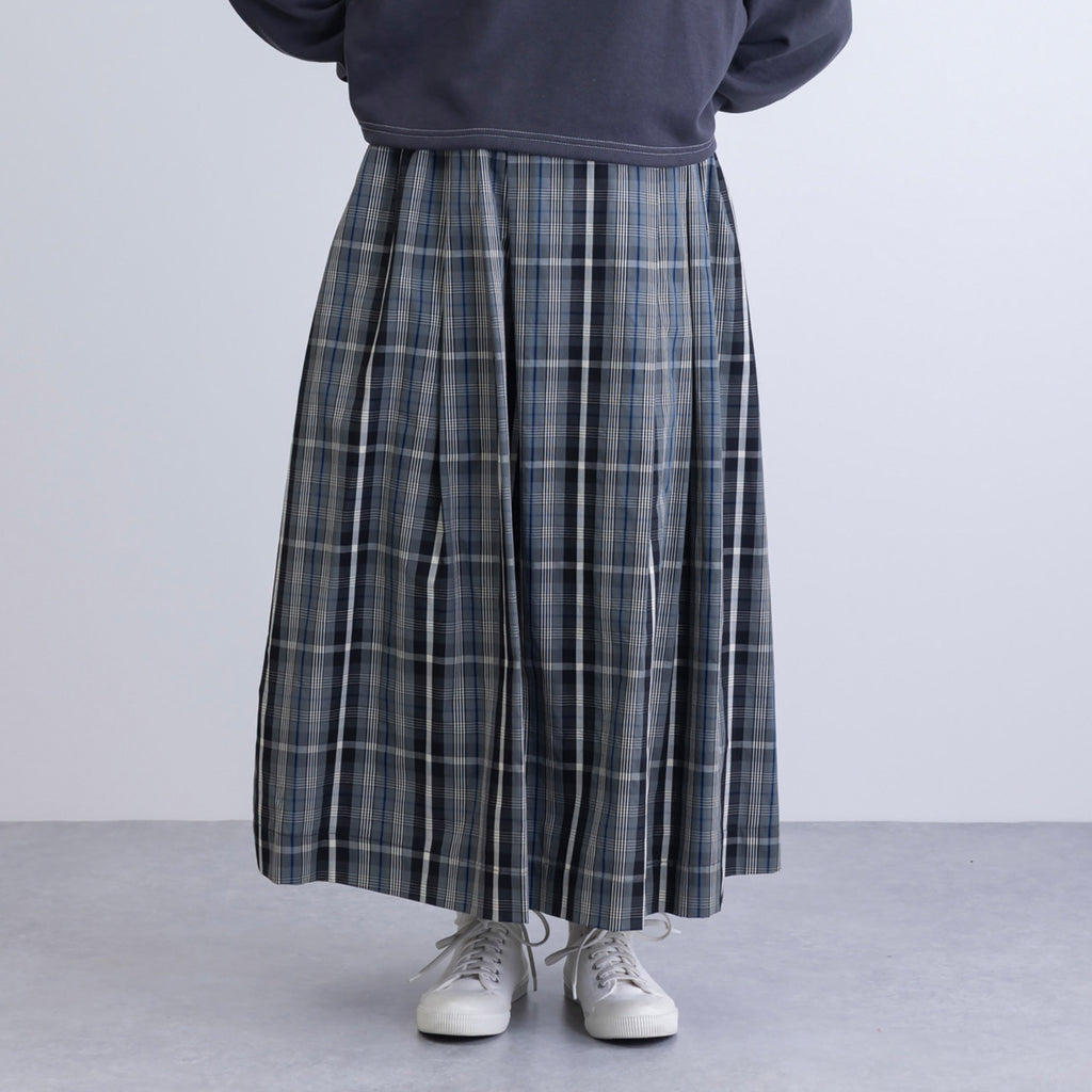 カジュアルになり過ぎない上品なチェック柄を使用したスカート。ウエストはゴム入りで快適な履き心地ながらも、中央部分はトップスインもきれいに決まる仕様。秋口から春先までコーディネート次第でロングシーズン着ていただけるアイテムです。