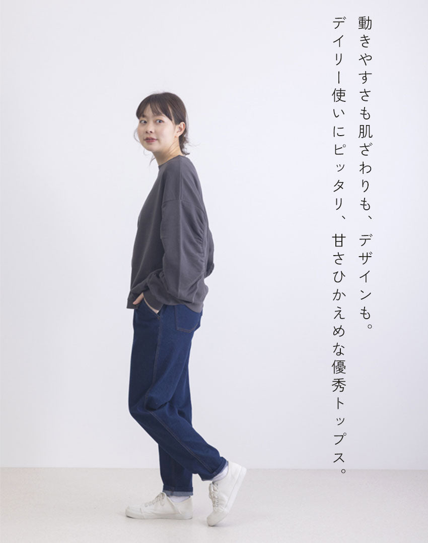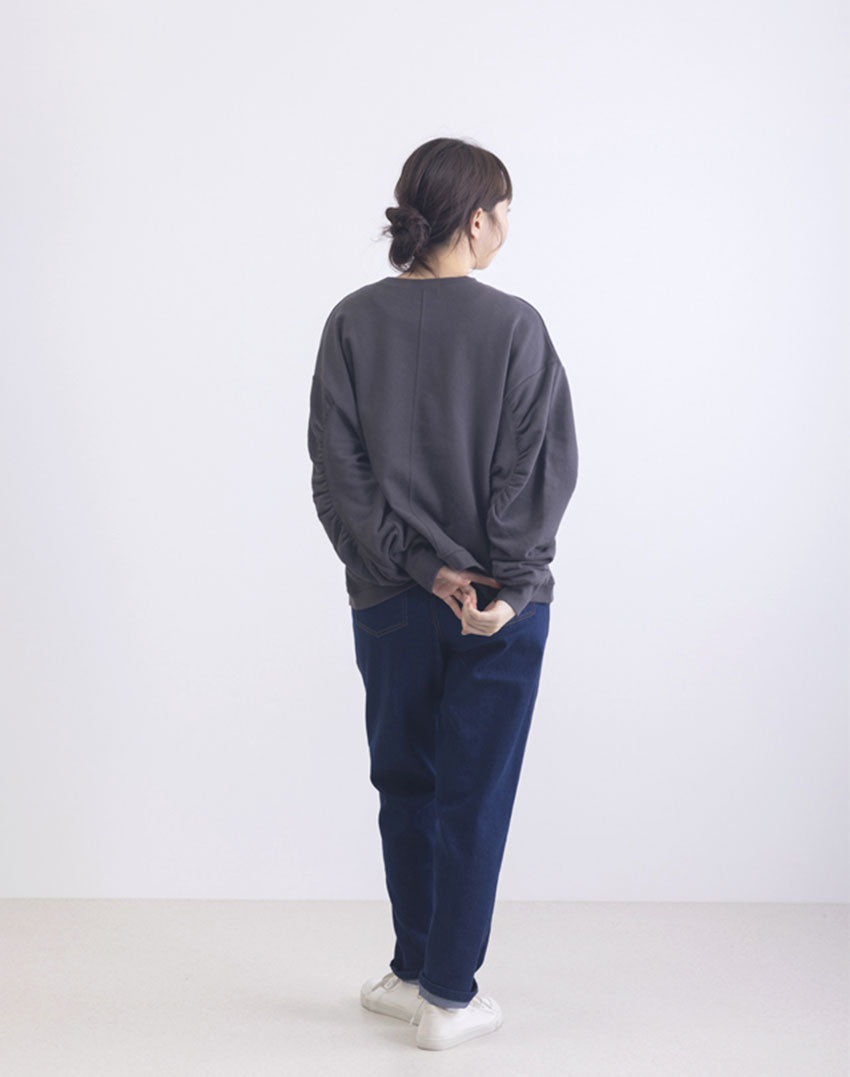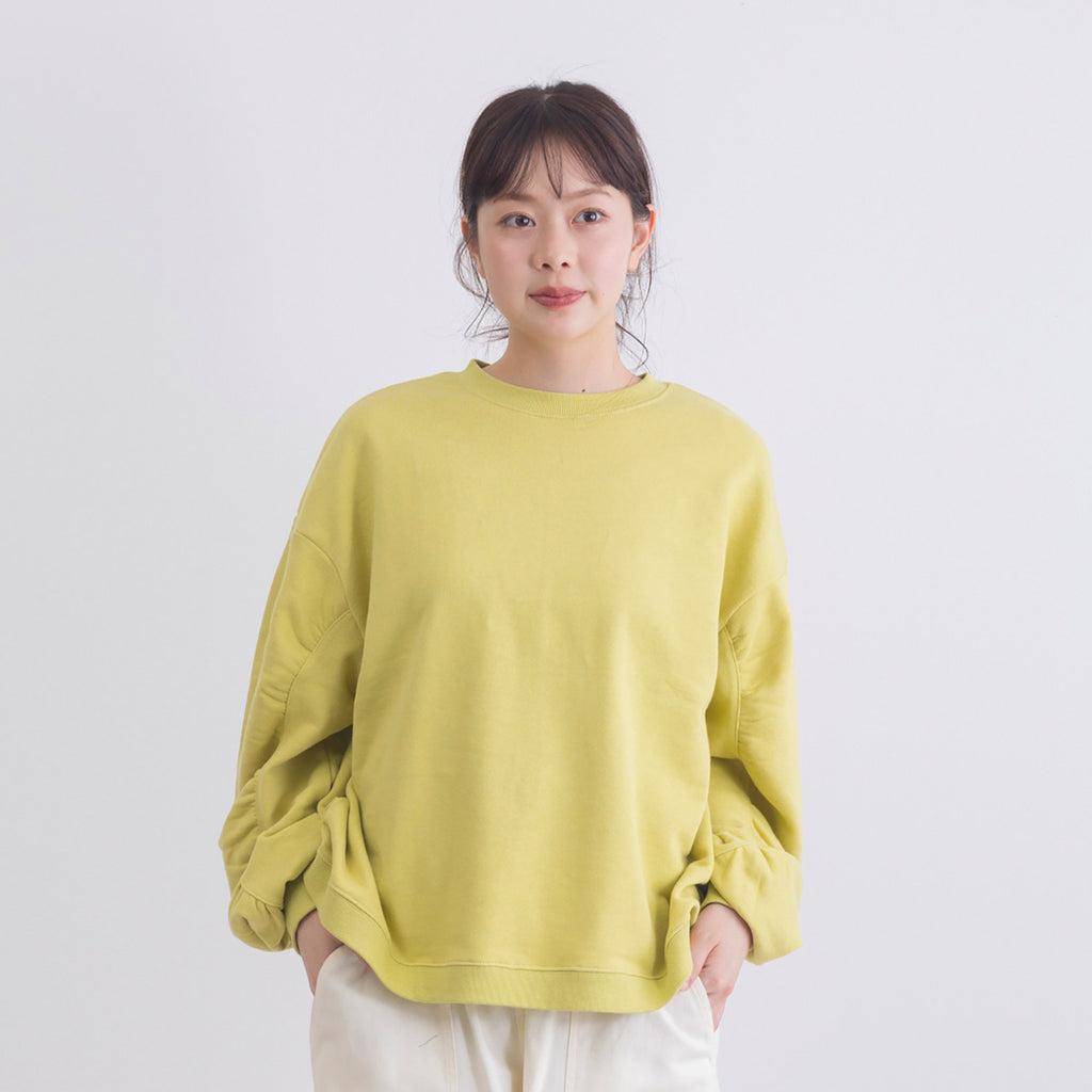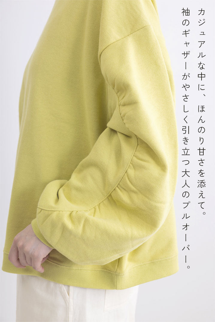 袖にギャザーを入れることで、カジュアルな中にもさりげない甘さをプラスした、大人のための裏毛プルオーバー。