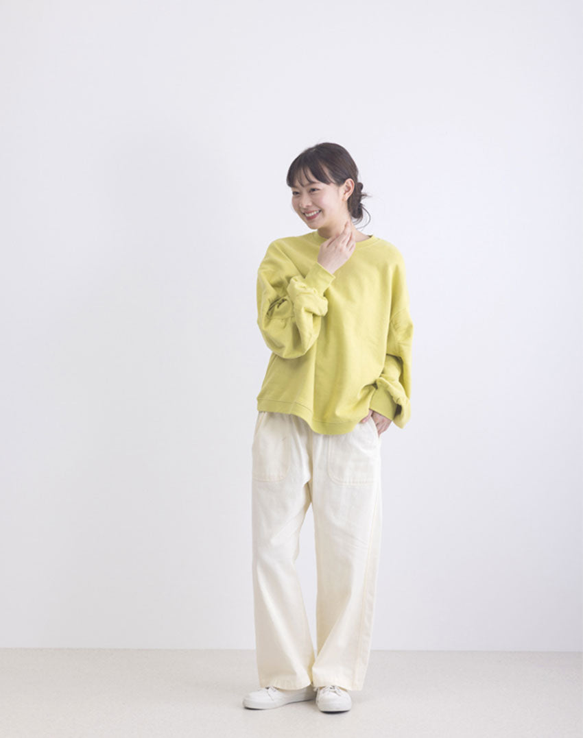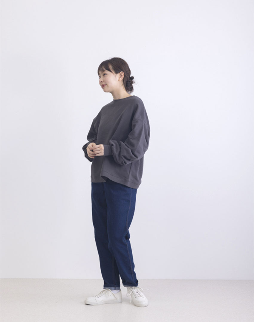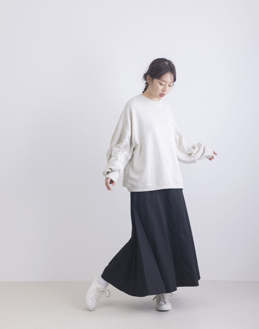 袖にギャザーを入れることで、カジュアルな中にもさりげない甘さをプラスした、大人のための裏毛プルオーバー。