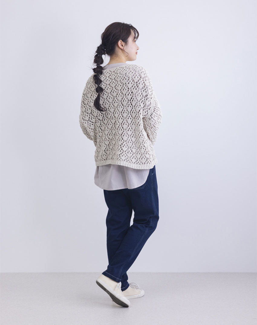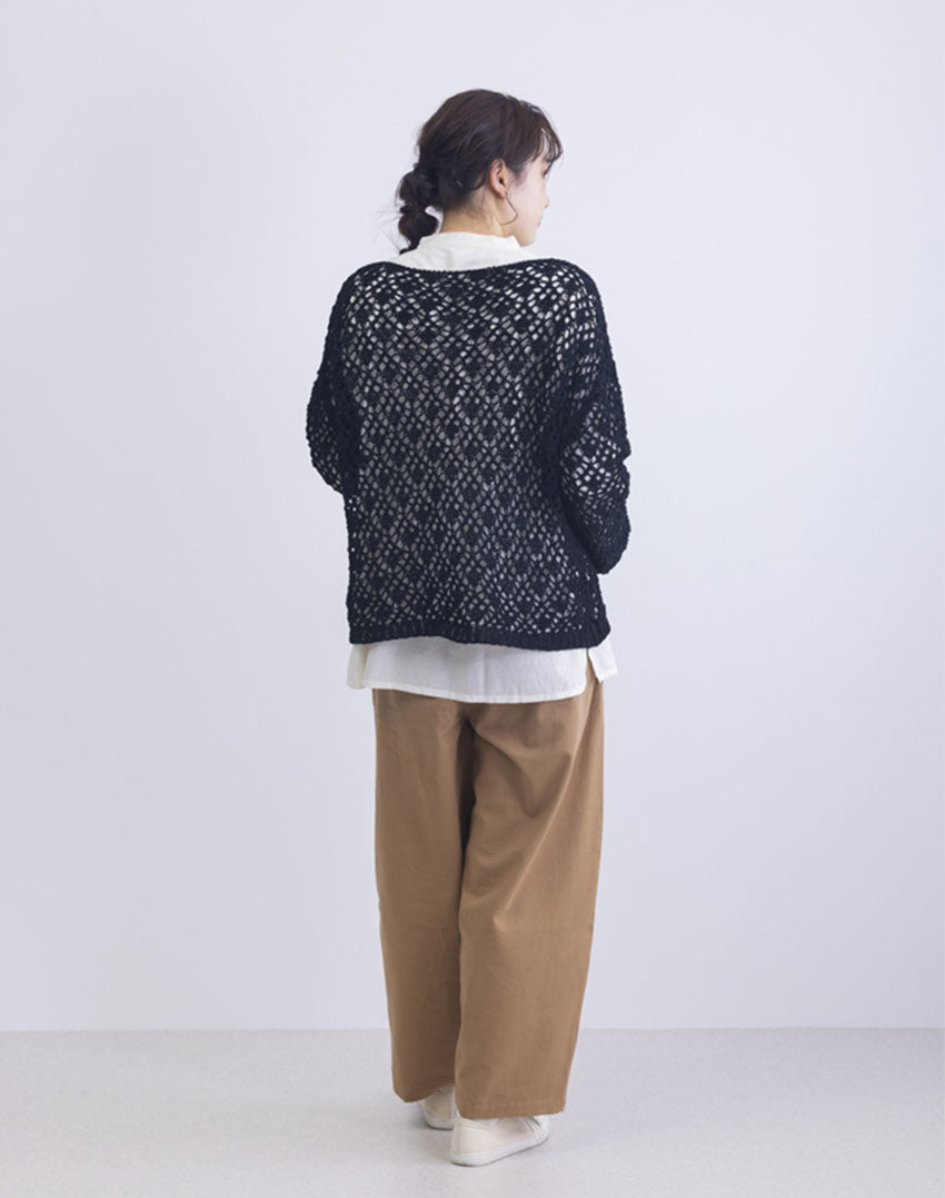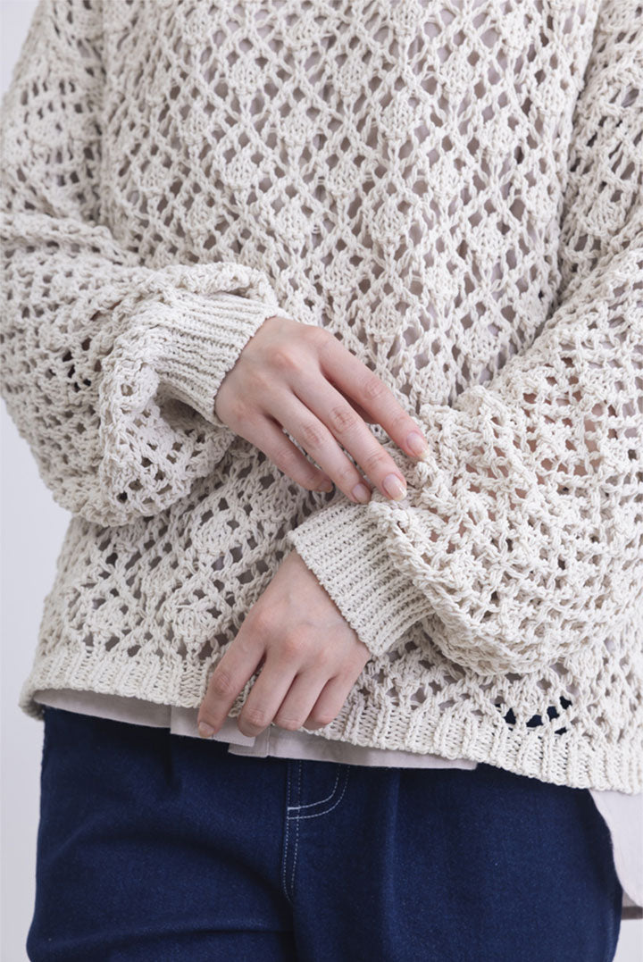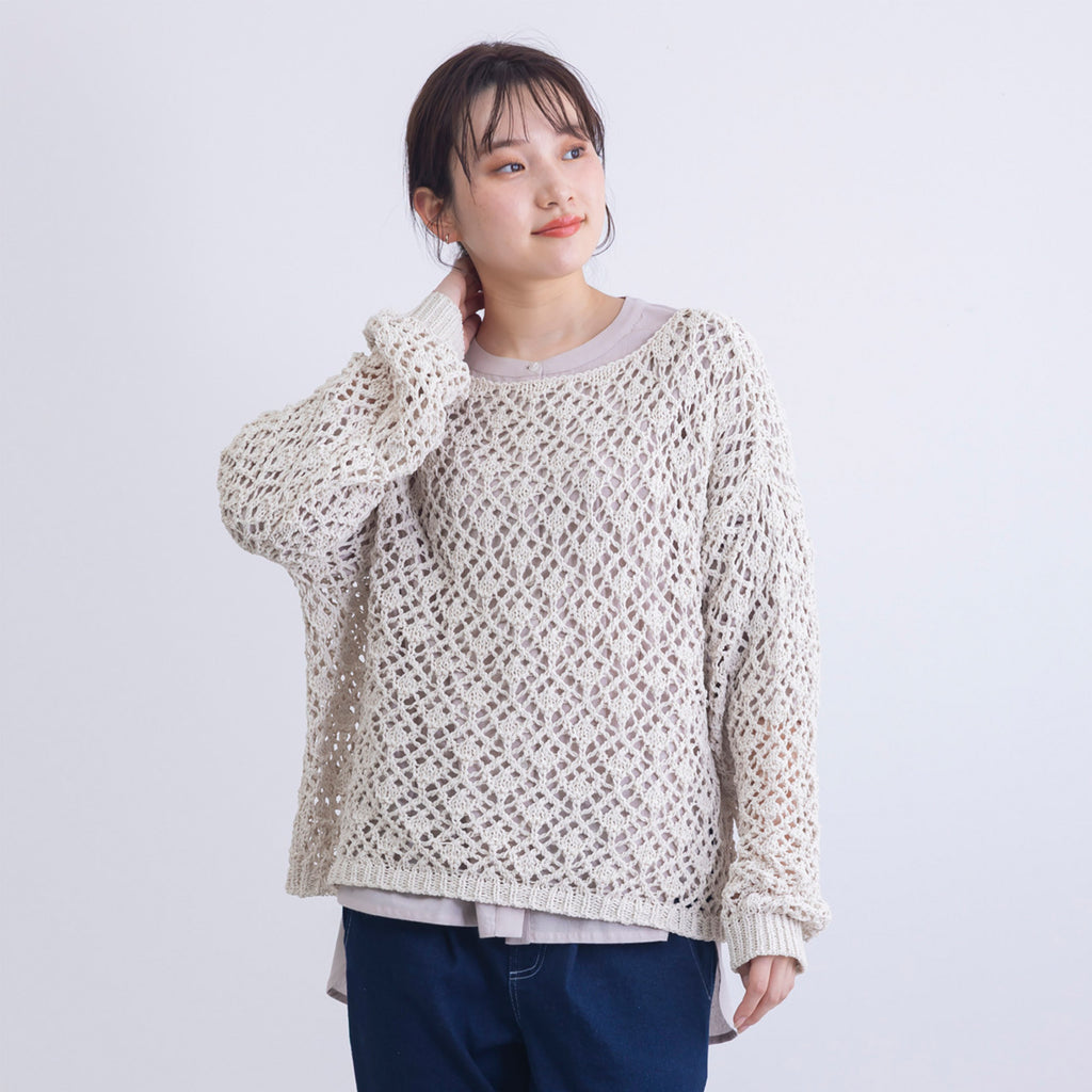 トレンドの“透かし編み”が目を惹く、モール素材のかぎ針ニットプルオーバー。