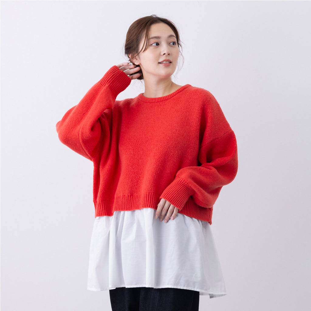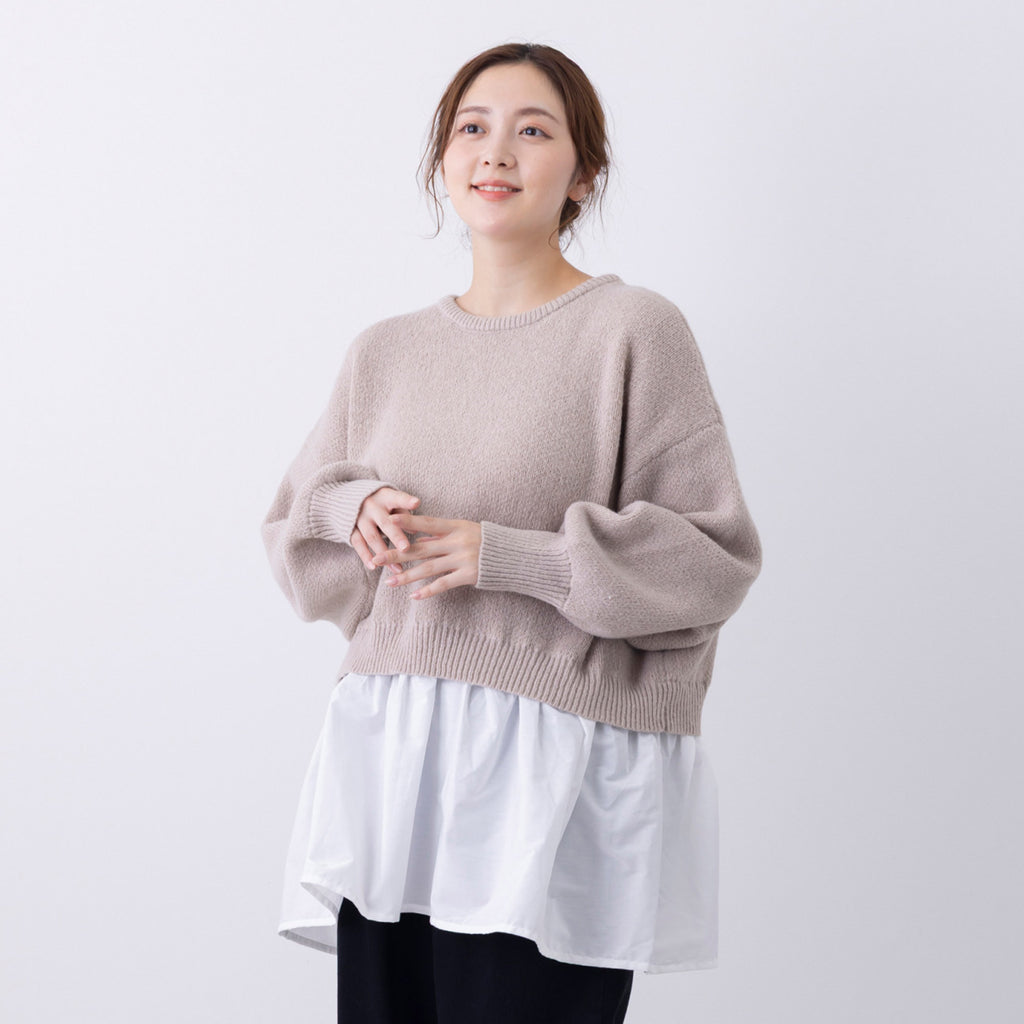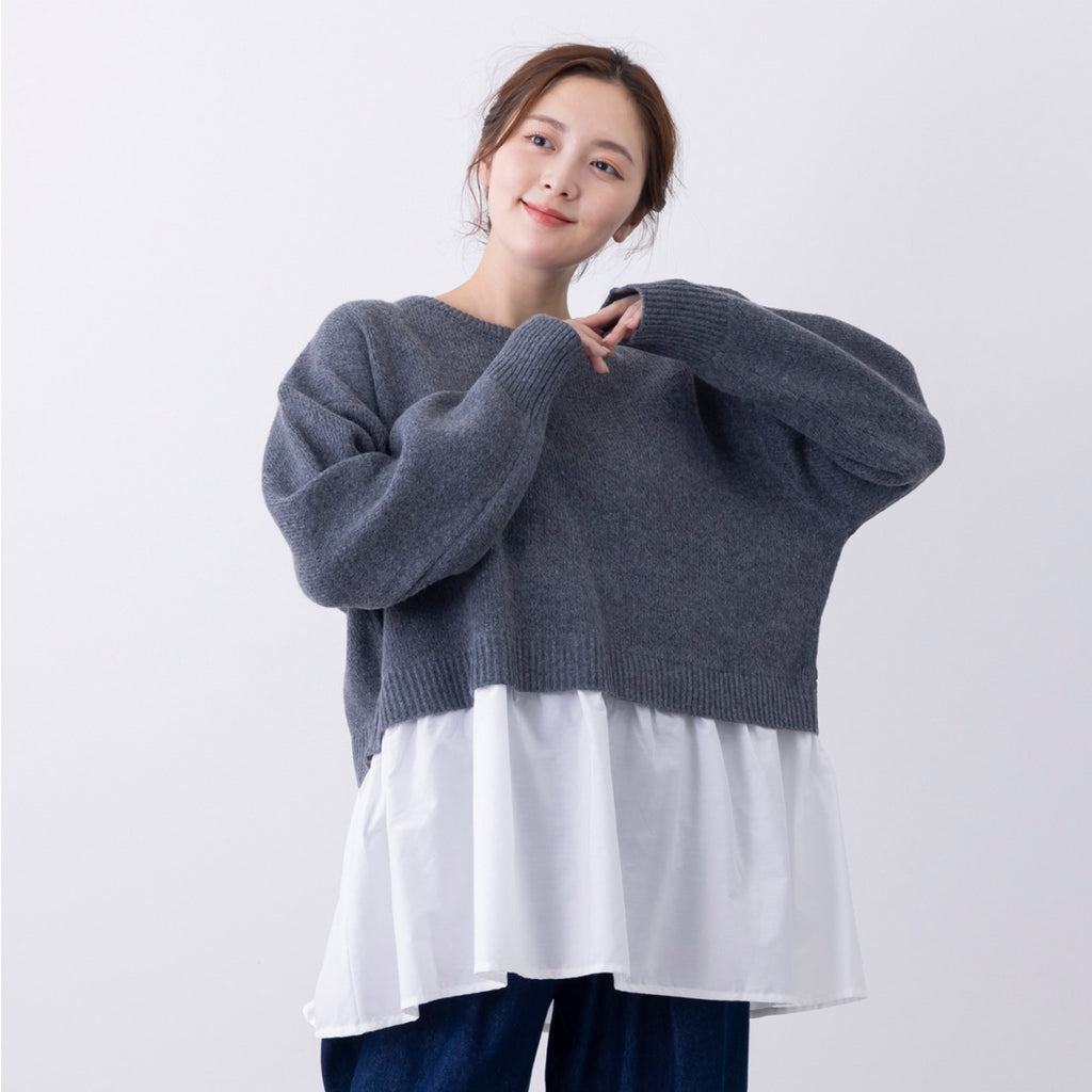 ニット部分の柔らかな着心地に、布帛素材をプラスすることでレイヤード風のデザインに仕上げました。