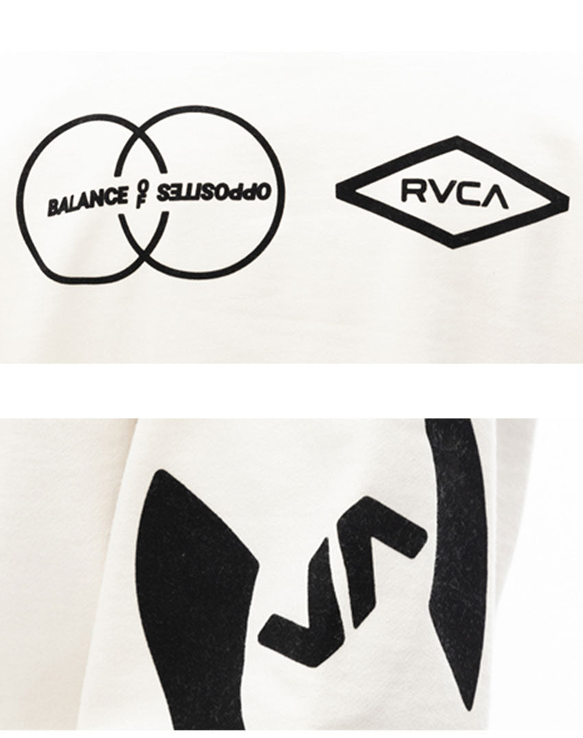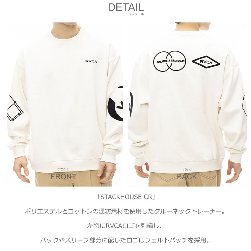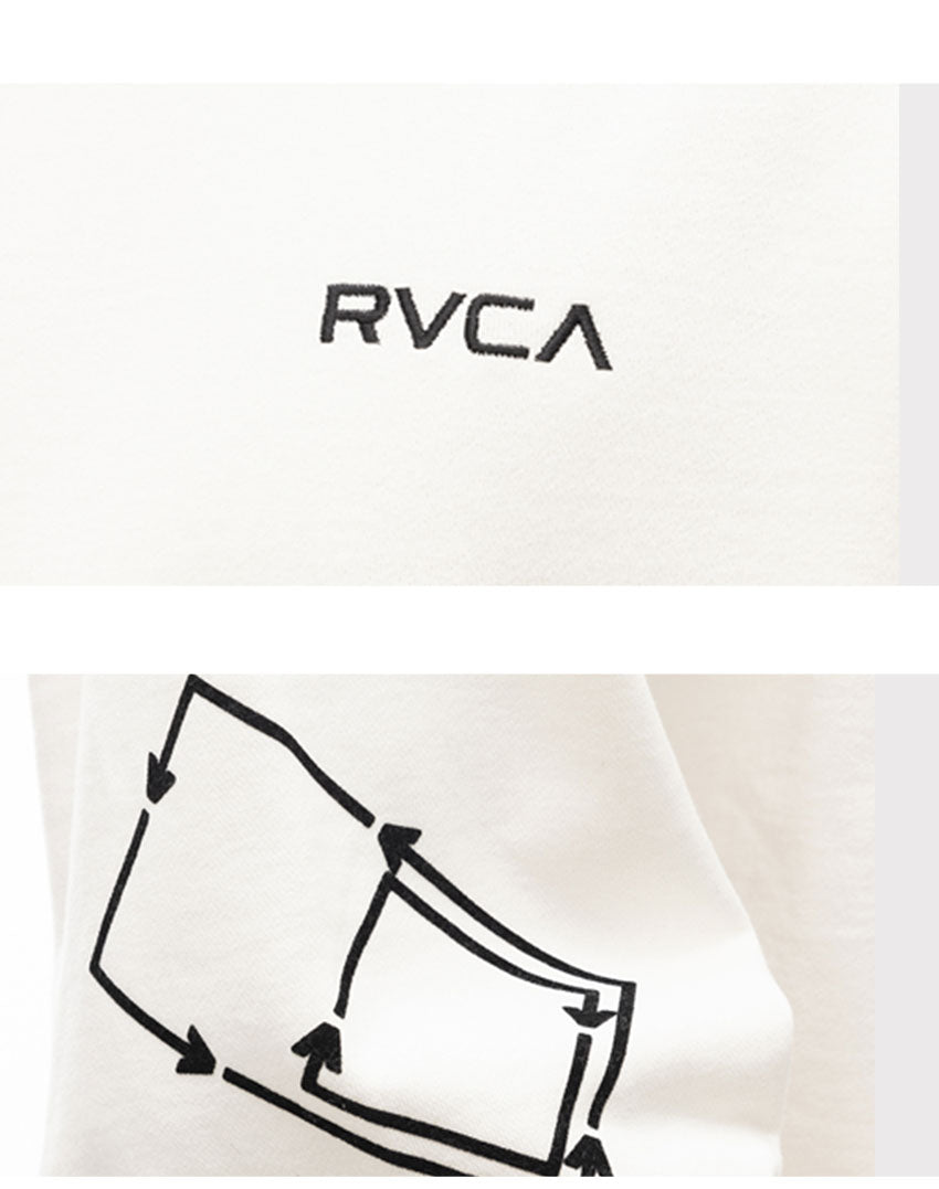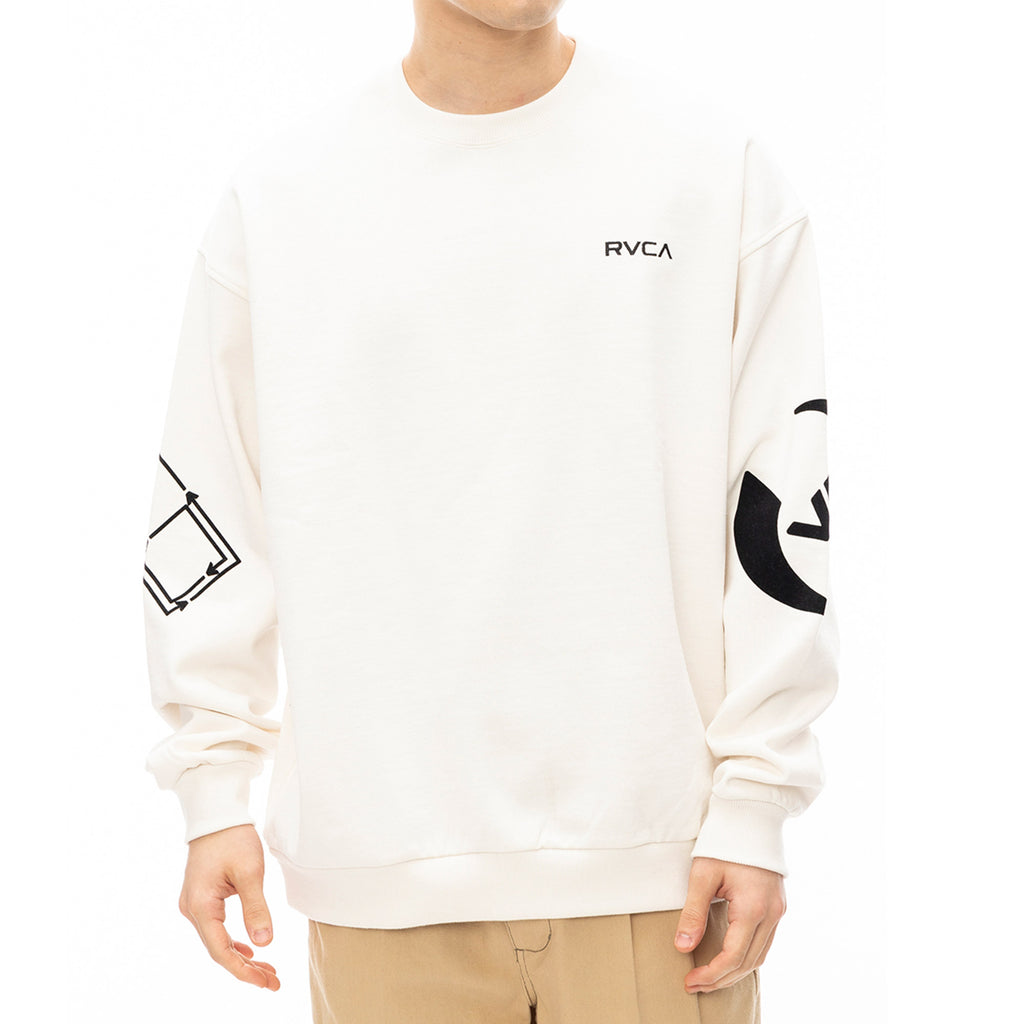 ポリエステルとコットンの混紡素材を使用したクルーネックトレーナー。左胸にRVCAロゴを刺しゅうし、背面やスリーブ部分に配したロゴはフェルトパッチを採用。肌面は柔らかくて暖かい起毛素材を使い、サイズ感は身幅が広く、全体的に大きめなシルエットを取り入れました。