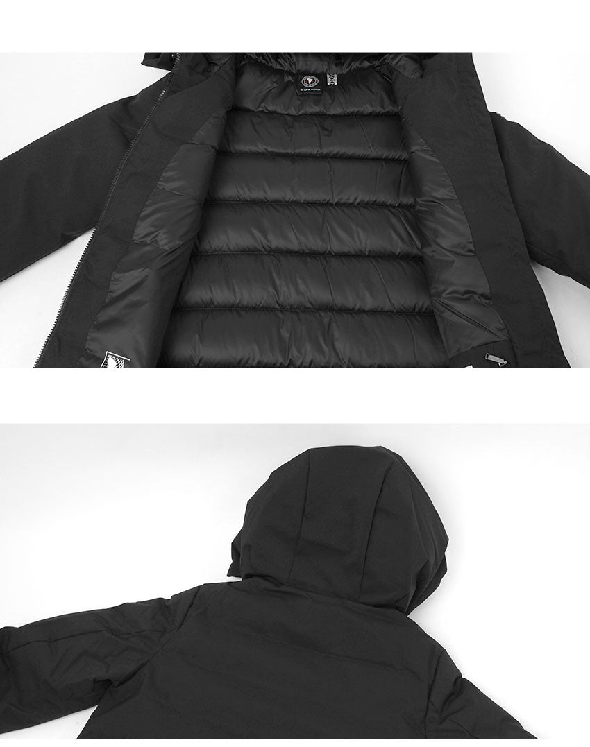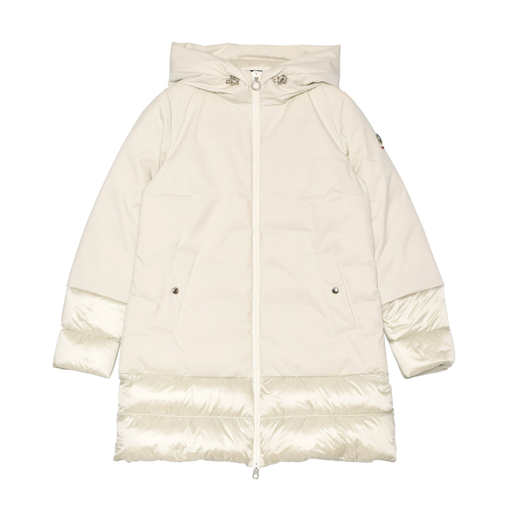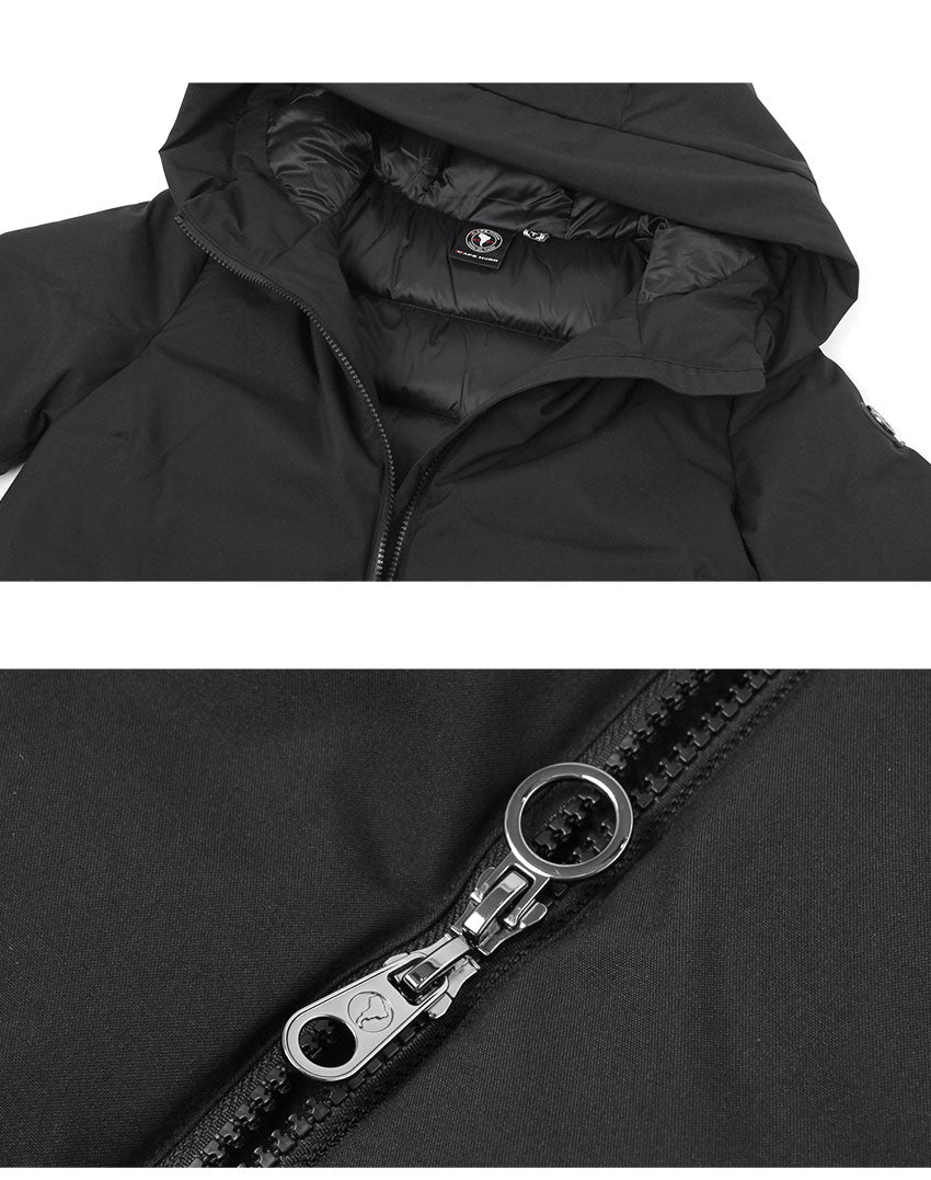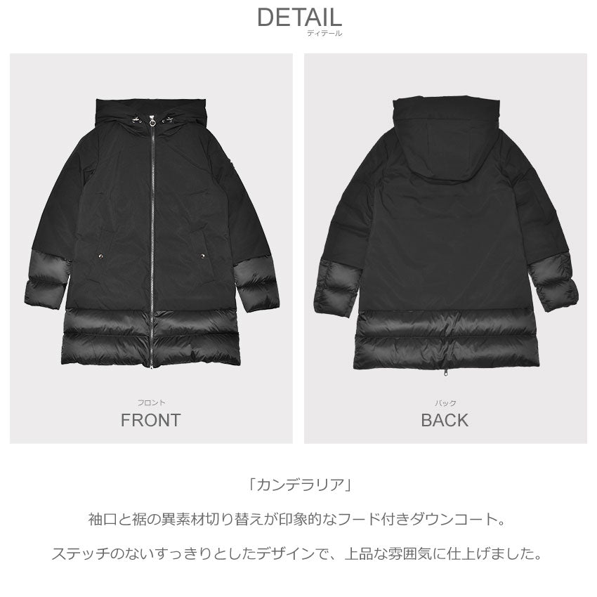 袖口と裾の異素材切り替えが印象的なフード付きダウンコート。ステッチのないすっきりとしたデザインで、上品な雰囲気に仕上げました。ややAラインに広がるシルエットで、ヒップまで覆う着丈で防寒性も抜群。中綿にはフェザーとダウンをブレンドし、ー10度の寒さにも対応します。フロントにはスナップ付きポケット2つと内側ジップポケットを備え、手を温めるフリース裏地も嬉しいポイント。ブランドのメタルロゴが上品に輝く一着です。
