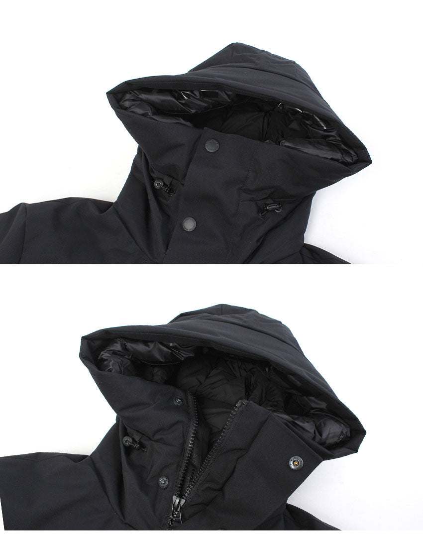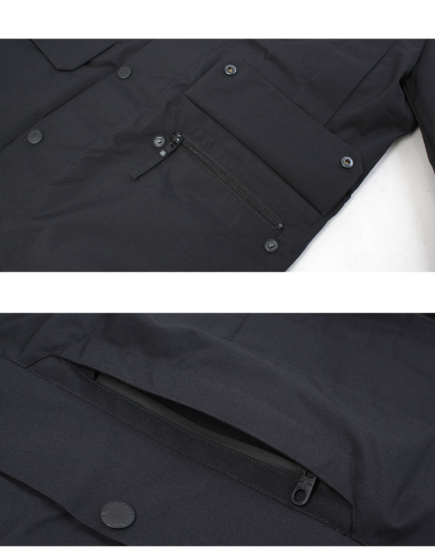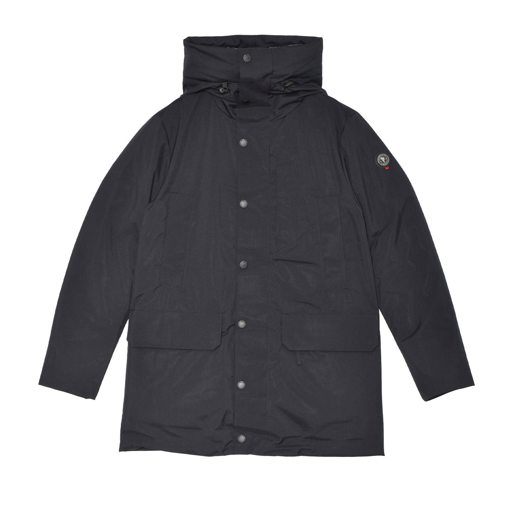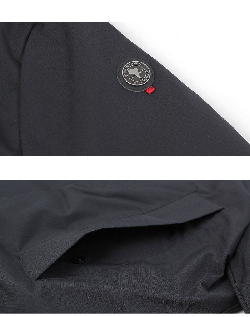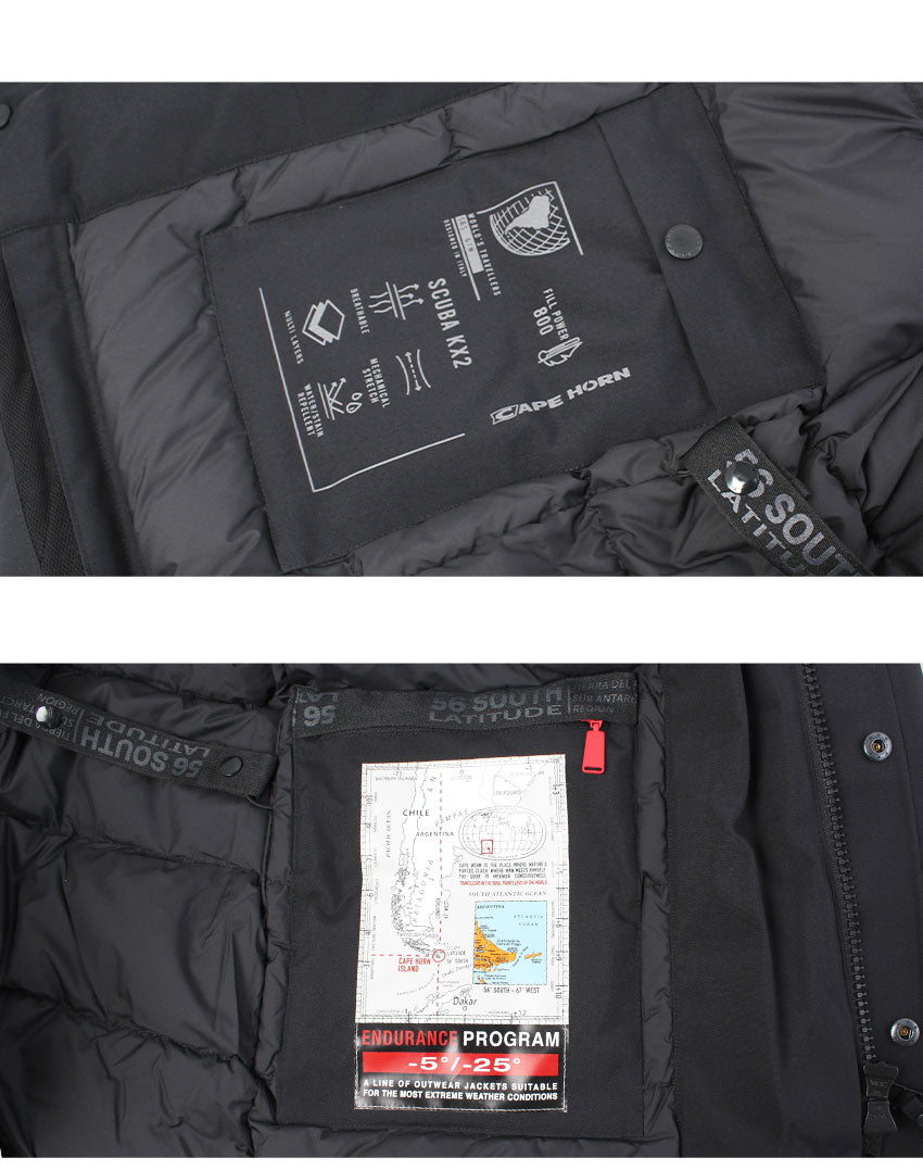 防水加工のSCUBAラミネート生地を使用し、天然ダウンを詰め込むことで、-25℃まで対応しながらも快適で動きやすい設計となっています。センタージッパーはボタン付きフラップで覆われ、調節可能な固定フード、取り外し可能なパッド入りの襟、バックパックとしても着用できる内側のストラップを備えています。フロントポケット5つ、内側に書類用ポケット3つ、防風インナーカフスなど、細部に至るまで、街と自然を行き来する人のために、妥協なくデザインされています。