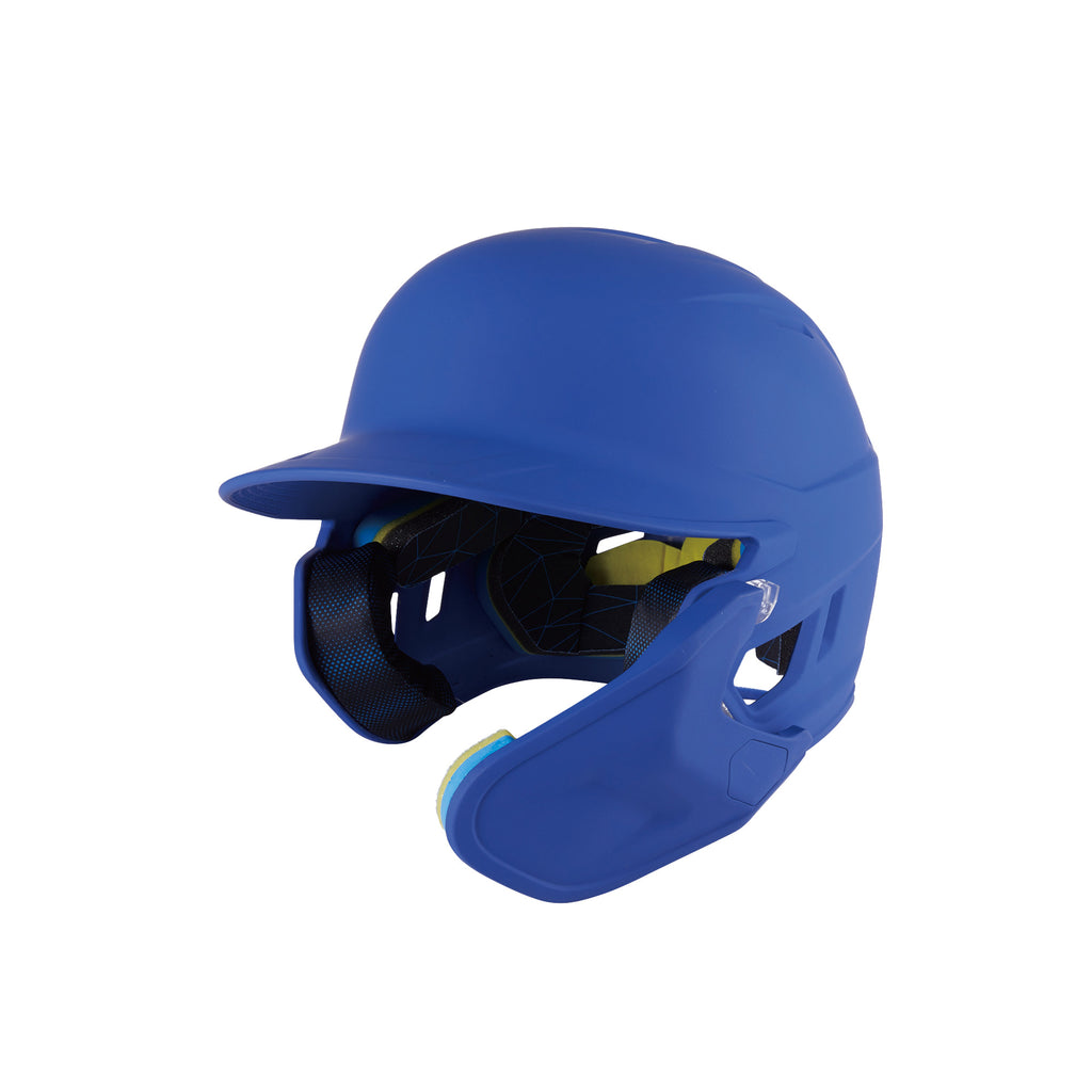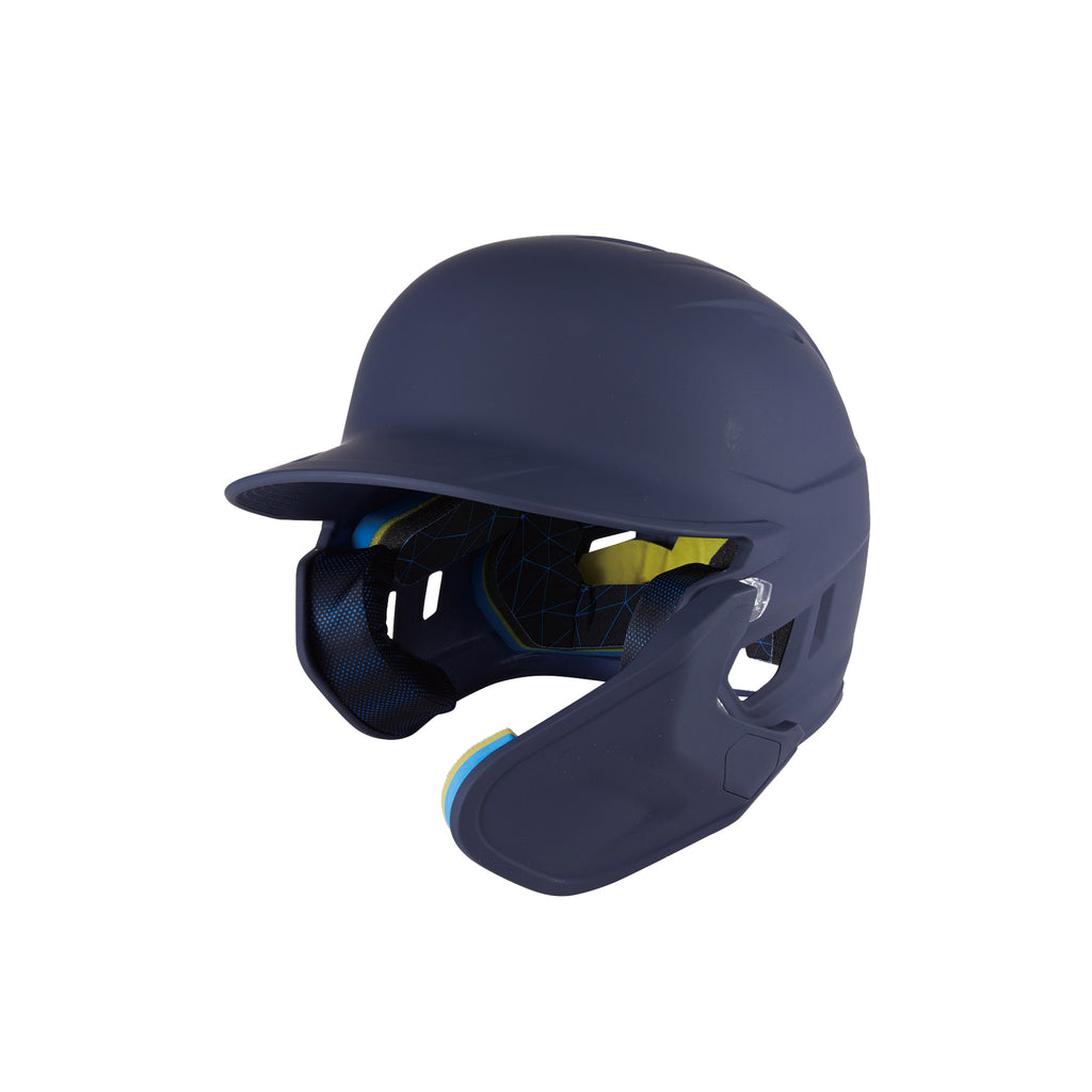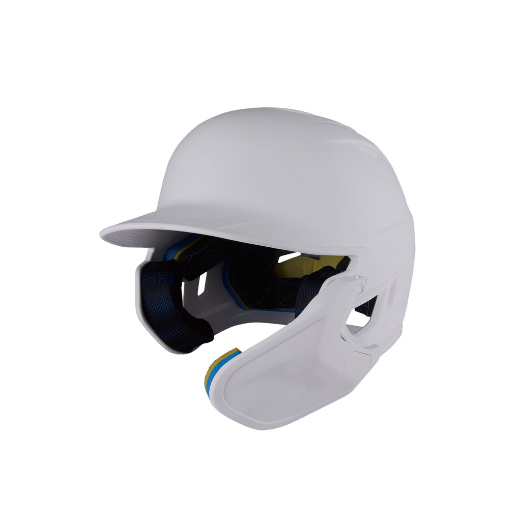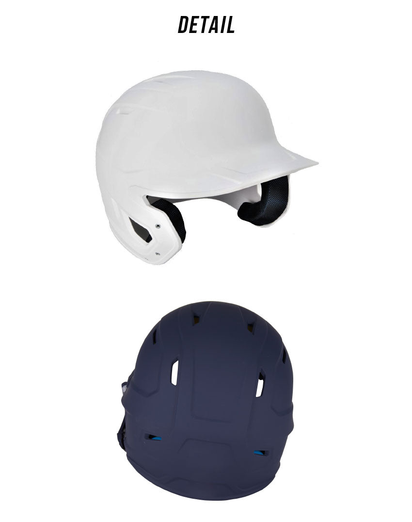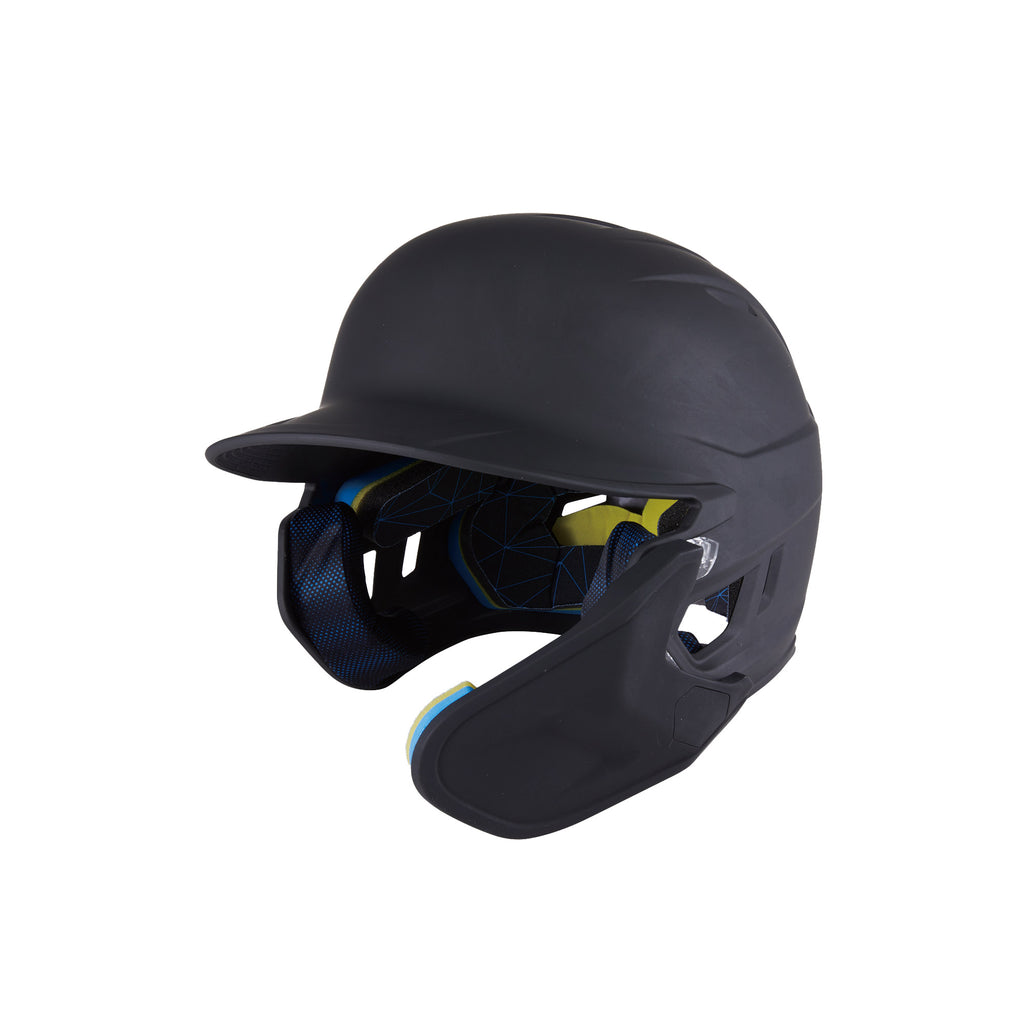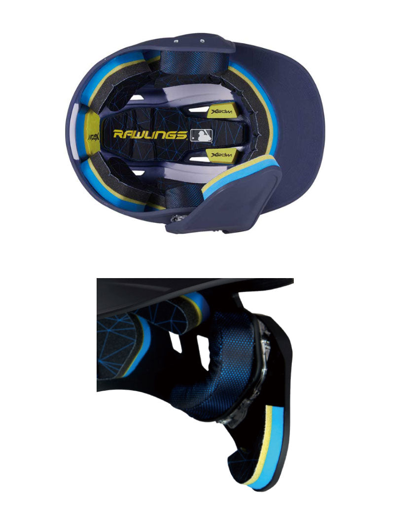 9種類の角度に簡単調整可能な顎ガード付きヘルメット。打席での恐怖心を取り除くと同時に選手それぞれに合った視野を確保。頭上部は、通気性を高くした設計。顎ガード部はMLB選手使用ずばりのものを採用。