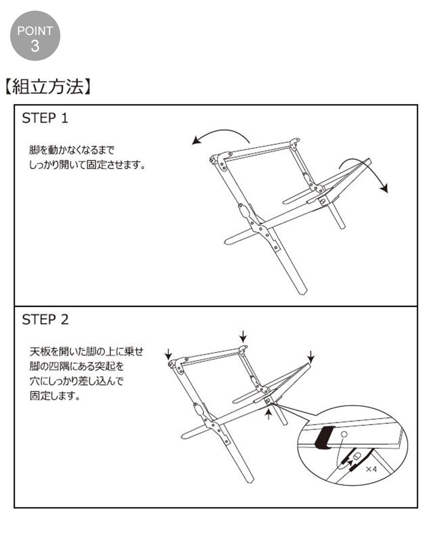アウトドアシーンや庭のデッキ等でも活躍する、組み立て式テーブル。収納袋がついて、持ち運びが便利です。インテリアとして普段からご使用いただくのもおすすめです。