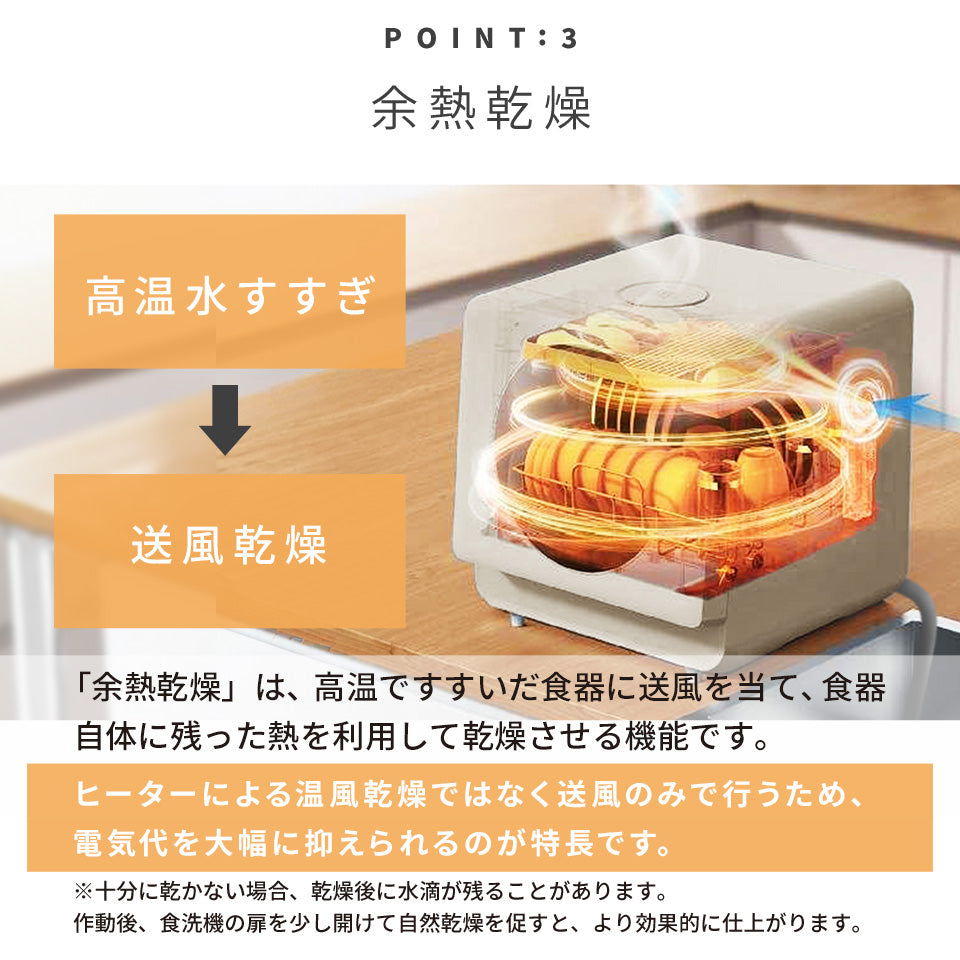 シンプルでコンパクトな食洗器。サイズがコンパクトなため、場所を取らない。最大で約40点の食器を洗うことができ、家族でも一人暮らしでも十分な容量です。食洗器専用の洗剤は、粉・ジェル・タブレットのすべてのタイプが使用可能です。取り付けは分岐水栓用ホースか自動給水ホースでつなぐだけ。運転コースは6コースあり、食器の汚れ具合に応じて最適なコースを選ぶことができます。手洗いと比べた際の一回分の水の使用量が15分の1と、かなり節約できるのも魅力的です。