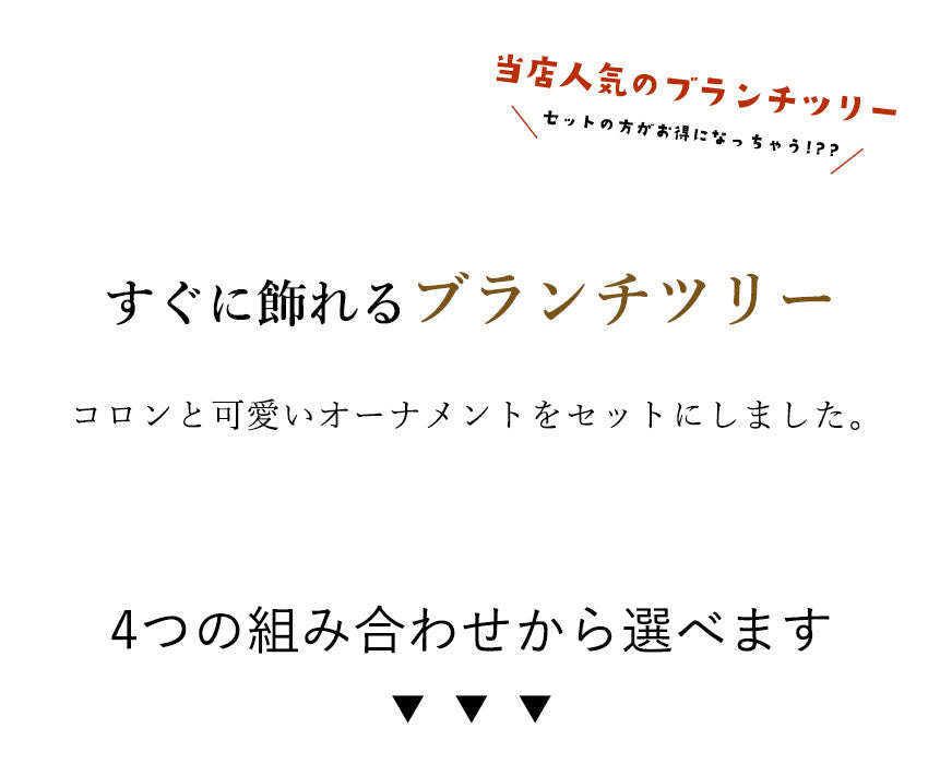 シンプルで馴染みやすいブランチツリーとオーナメントのセット。お部屋をお好みの雰囲気に飾ることができます。オーナメントを外して、お部屋のインテリアやクリスマス用の枝の飾りとしてもお使いいただける、万能アイテムです!