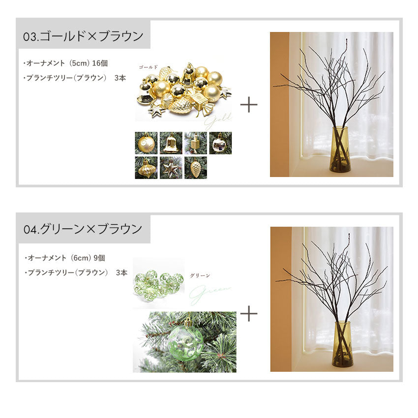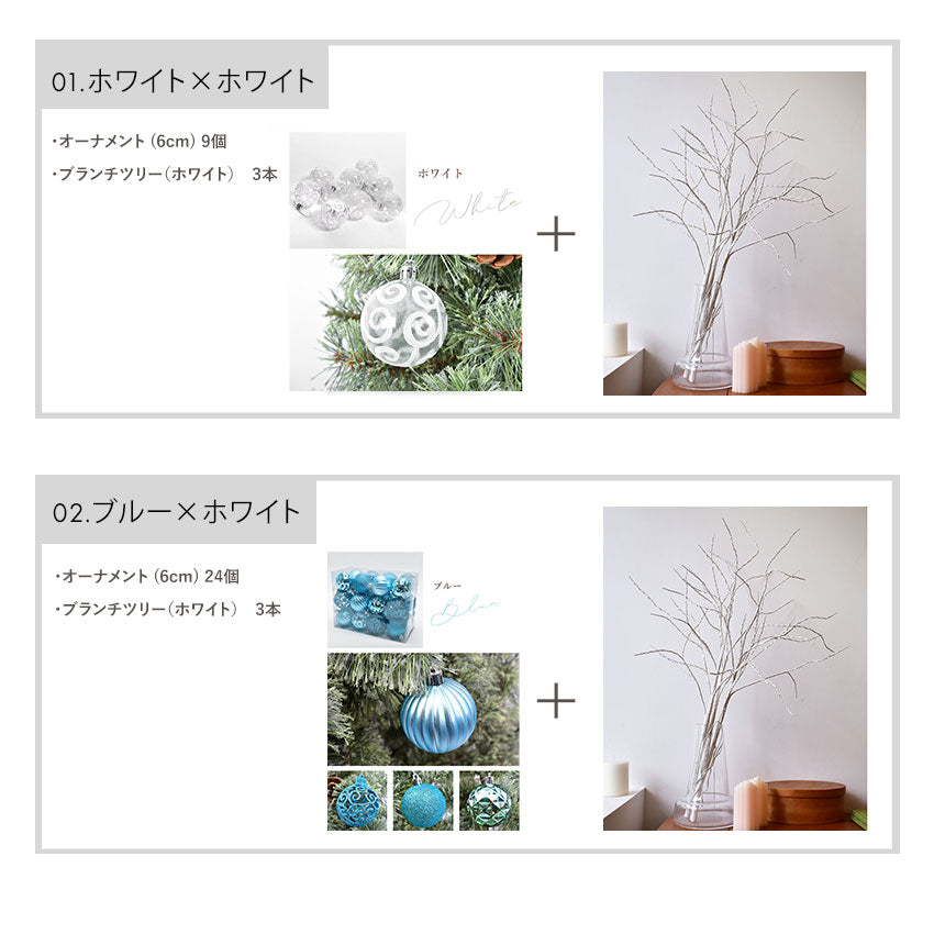 シンプルで馴染みやすいブランチツリー(3本)とオーナメントのセット。お部屋をお好みの雰囲気に飾ることができます。オーナメントを外して、お部屋のインテリアやクリスマス用の枝の飾りとしてもお使いいただける、万能アイテムです!