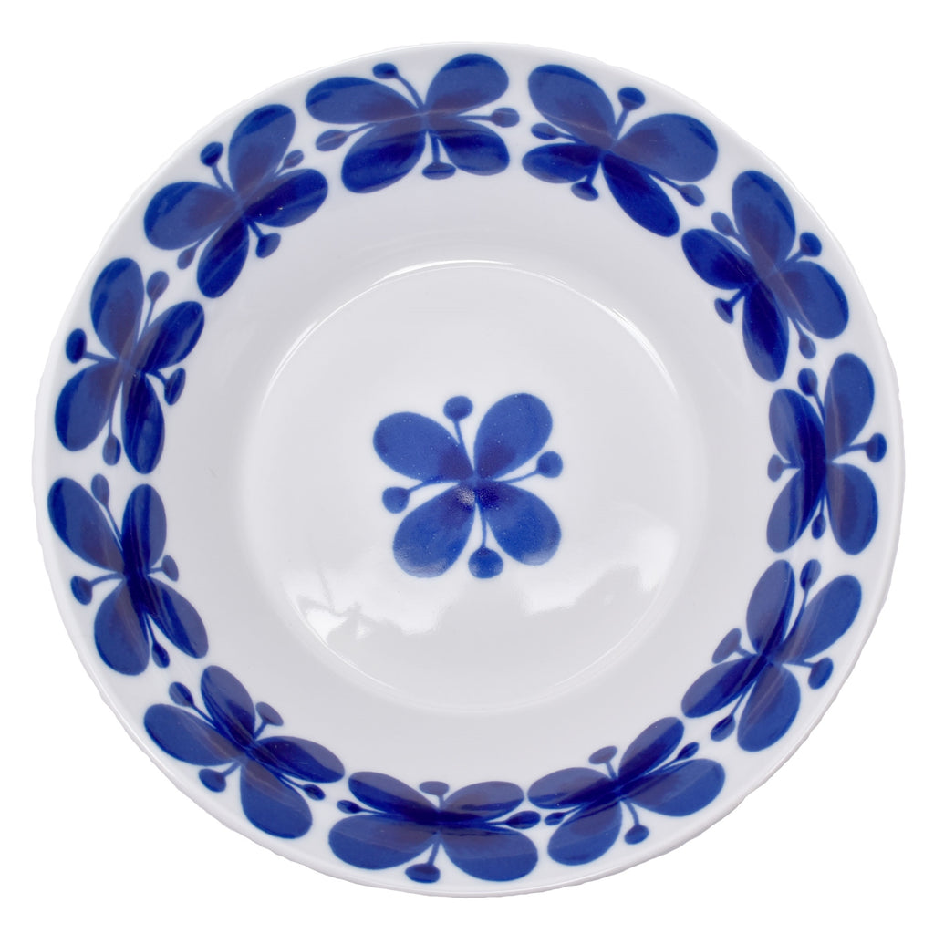 白地に鮮やかなブルーのお花が散りばめられたデザインのボウル。丼として使ったり、サラダやスープなどを盛り付けるのにも重宝するサイズです。